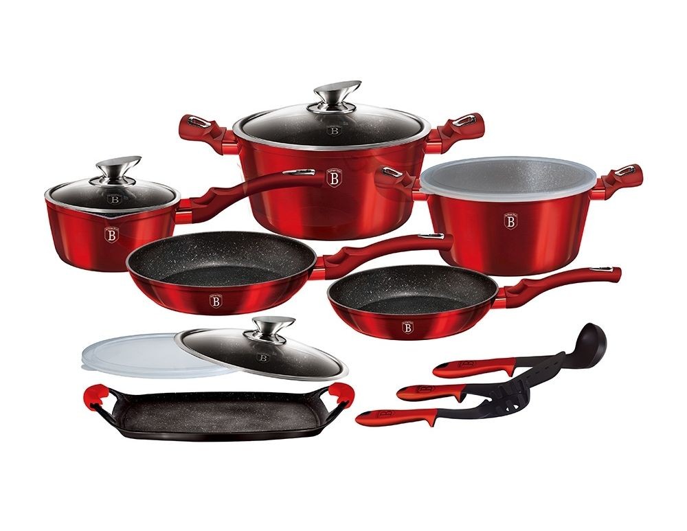 Vyjímečná sada nádobí značky Berlingerhaus edice Burgundy Metallic Line se skládá celkem ze 14 kusů nádobí a kuchyňského náčiní. Nádobí v elegantním designu má 3vrstvý mramorový povrch, který je charakteristický svou dokonalou nepřilnavostí. Připravované potraviny se nepřipalují a díky tomu se nádobí velmi jednoduše čistí. Zároveň je vhodný pro zdravé vaření s minimem tuku nebo oleje a můžete uspořit až 35 % energie a času oproti obyčejným nerezovým kastrolům.