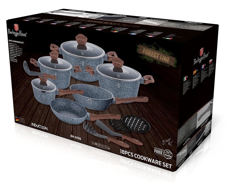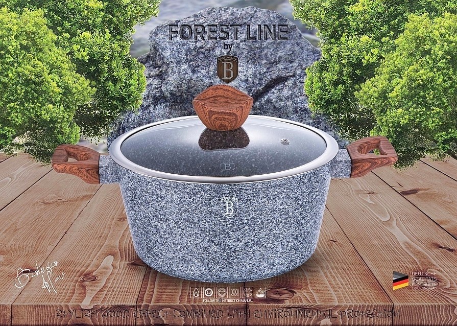 Bohatě vybavená sada nádobí kolekce Forest Line s mramorovým povrchem vás nadchne svým atraktivním designem. Díky skladovacím víkům, které jsou také součástí sady, můžete v uzavřených hrncích i pánvích pohodlně skladovat hotové pokrmy i v lednici a klidně je navíc stohovat na sebe.