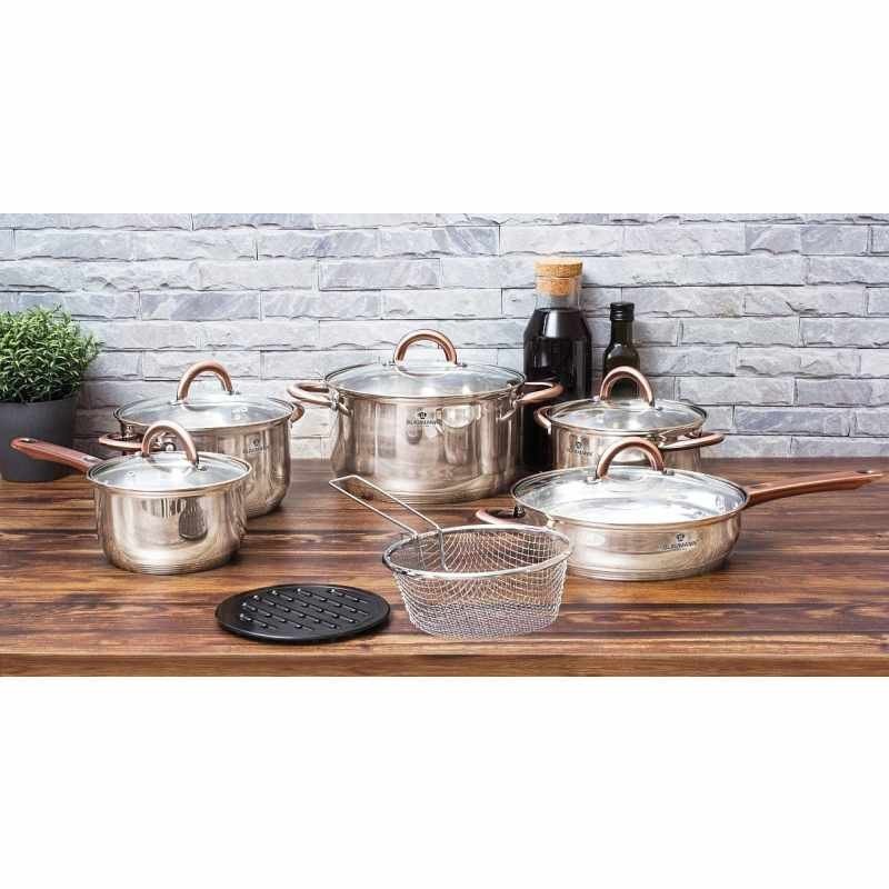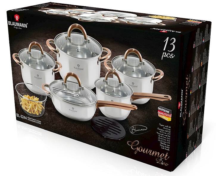 Sada Blaumann Gourmet Line obsahuje celkem 13 kusů nádobí (rendlík, pokličky, pánev, hrnce, fritovací koš s rukojetí a bakelitová podložka). Usnadníte si každodenní vaření obědů a večeří. Můžete s nimi připravovat vaše oblíbené pokrmy na všech druzích sporáku, včetně indukce. Zároveň vás potěší, že ho bez obav umyjete v myčce.
