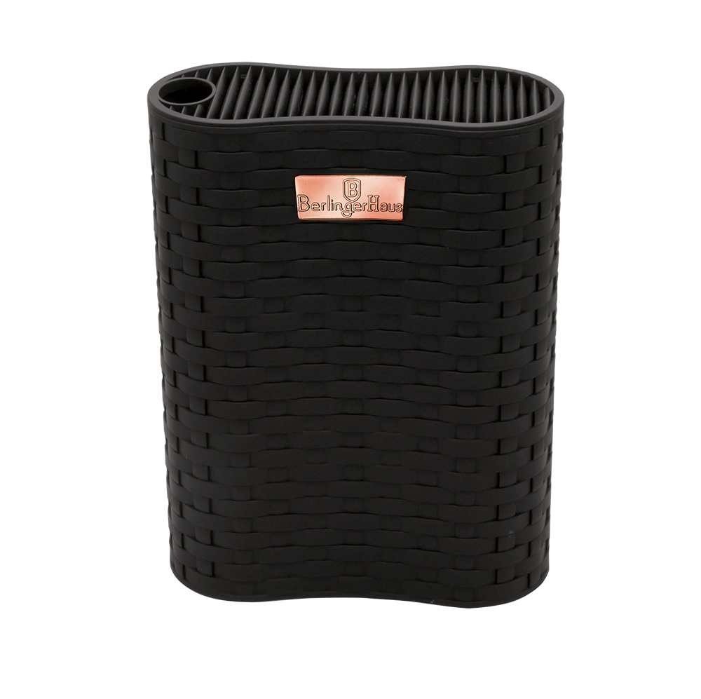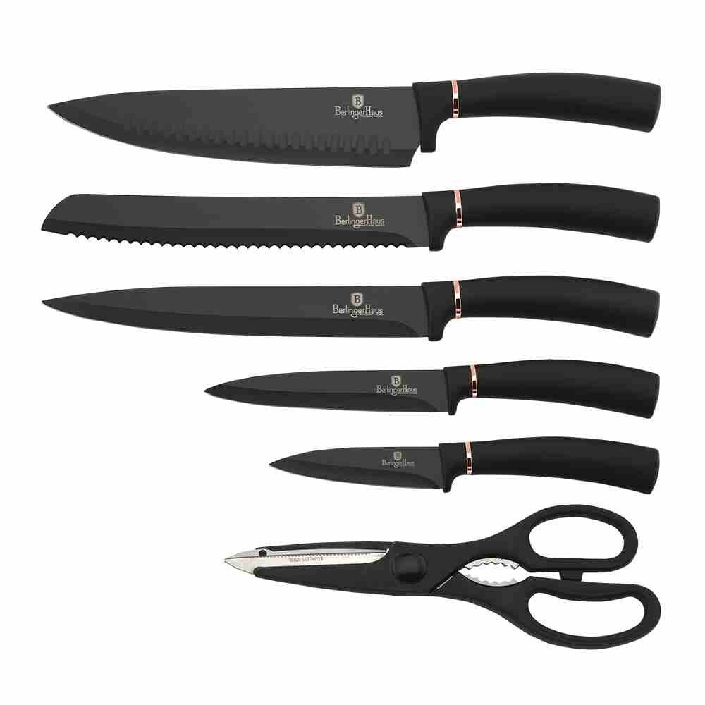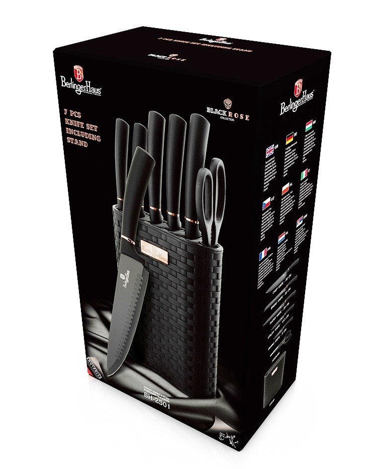 Sada Berlingerhaus Black Rose Collection se skládá z 5 nožů, nůžek a stojanu. Perfektně ostré čepele jsou potažené titanovým nepřilnavým povrchem. Díky laserovému broušení na nich krájené potraviny neulpívají, a vy je tak snadno očistíte. Antibakteriální úprava zajistí, že se při krájení nepřenáší nežádoucí pachy. Suroviny si navíc zachovají všechny prospěšné vitamíny a výživové hodnoty.