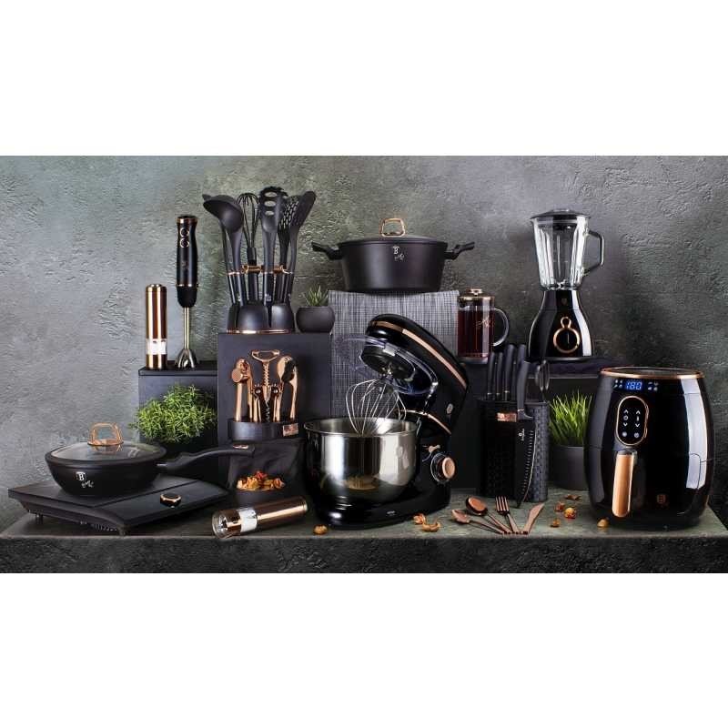 5 kvalitních nožů využijete na rozřezávání a krájení různých potravin. Najdete mezi nimi Santoku nůž délky 17,5 cm, kuchařský nůž délky 20 cm, nůž na pečivo délky 20 cm, univerzální nůž o délce 12,5 cm a 9cm loupací nůž. Jistě využijete také univerzální nůžky. Všechno náčiní ze sady uložíte do praktického stojanu. Stylový a do detailu sladěný design kolekce Black Rose elegantně doplní každou kuchyni.