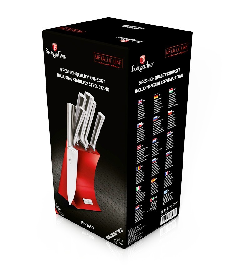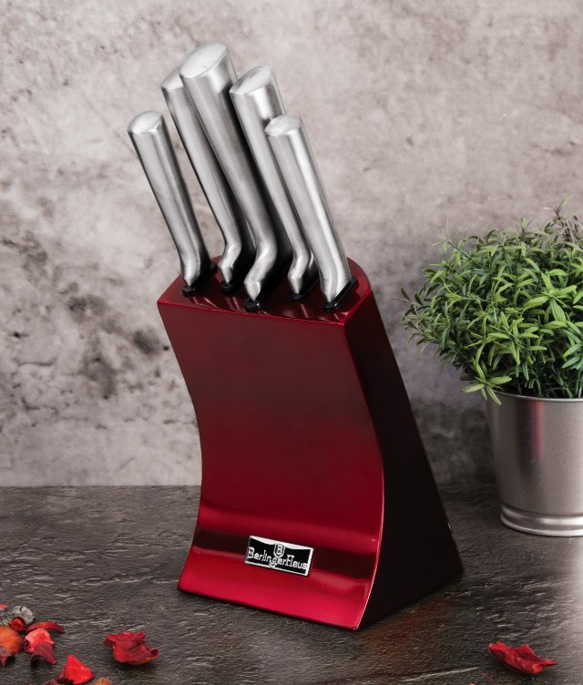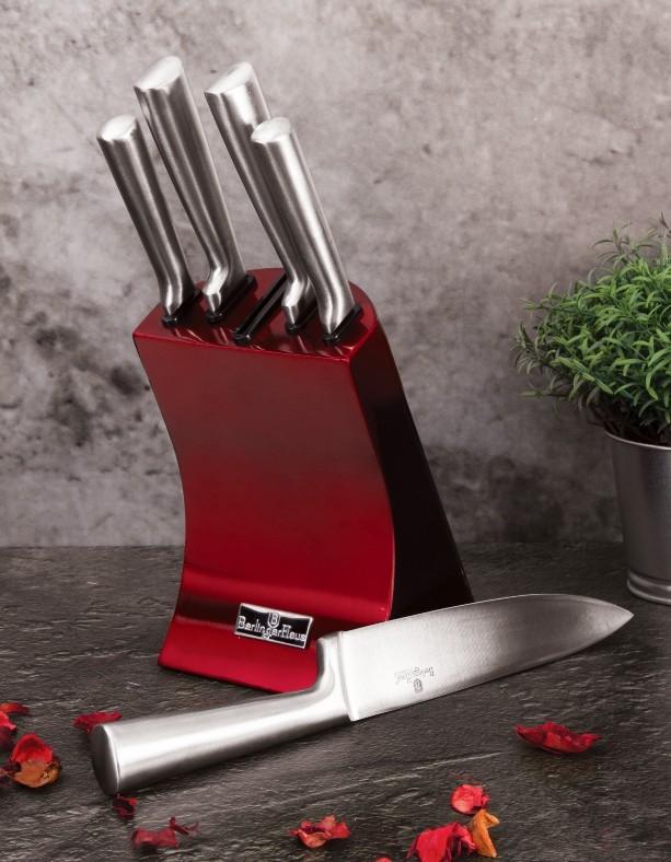 Krásná sada edice Burgundy Metallic Line obsahuje 5 nožů, které mají čepele kované z jednoho kusu oceli. Nepřilnavé laserem broušené čepele zajišťují maximální kvalitu ostří. Sada obsahuje navíc i designový stojan na nože v metalické červené barvě. Nože můžete mýt v myčce nádobí.