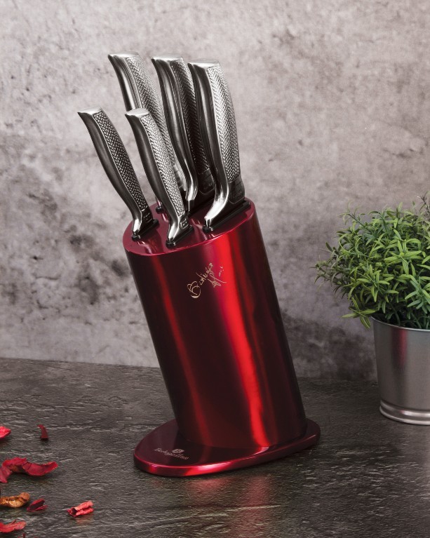 Elegantní sada edice Burgundy Metallic Line obsahuje 5 nožů, které mají čepele z jednoho kusu oceli s nepřilnavým povrchem. Laserem broušené čepele zajišťují maximální kvalitu ostří. Nože můžete standardně jako každé jiné brousit ocílkou, na brusném kameni nebo keramickým brouskem. Sada obsahuje navíc i designový stojan na nože v metalické červené barvě. Nože můžete mýt v myčce nádobí.