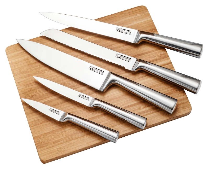 Set obsahuje šéfkuchařský, porcovací, univerzální a kuchyňský nůž, dřevěné prkénko, stojan a nůž na pečivo. Veškeré kuchyňské pomůcky se vám v ruce bezpečně a pohodlně drží. Jsou totiž vybavené ergonomicky tvarovanou rukojetí. Díky kvalitnímu provedení vám sada vydrží po dlouhou dobu.