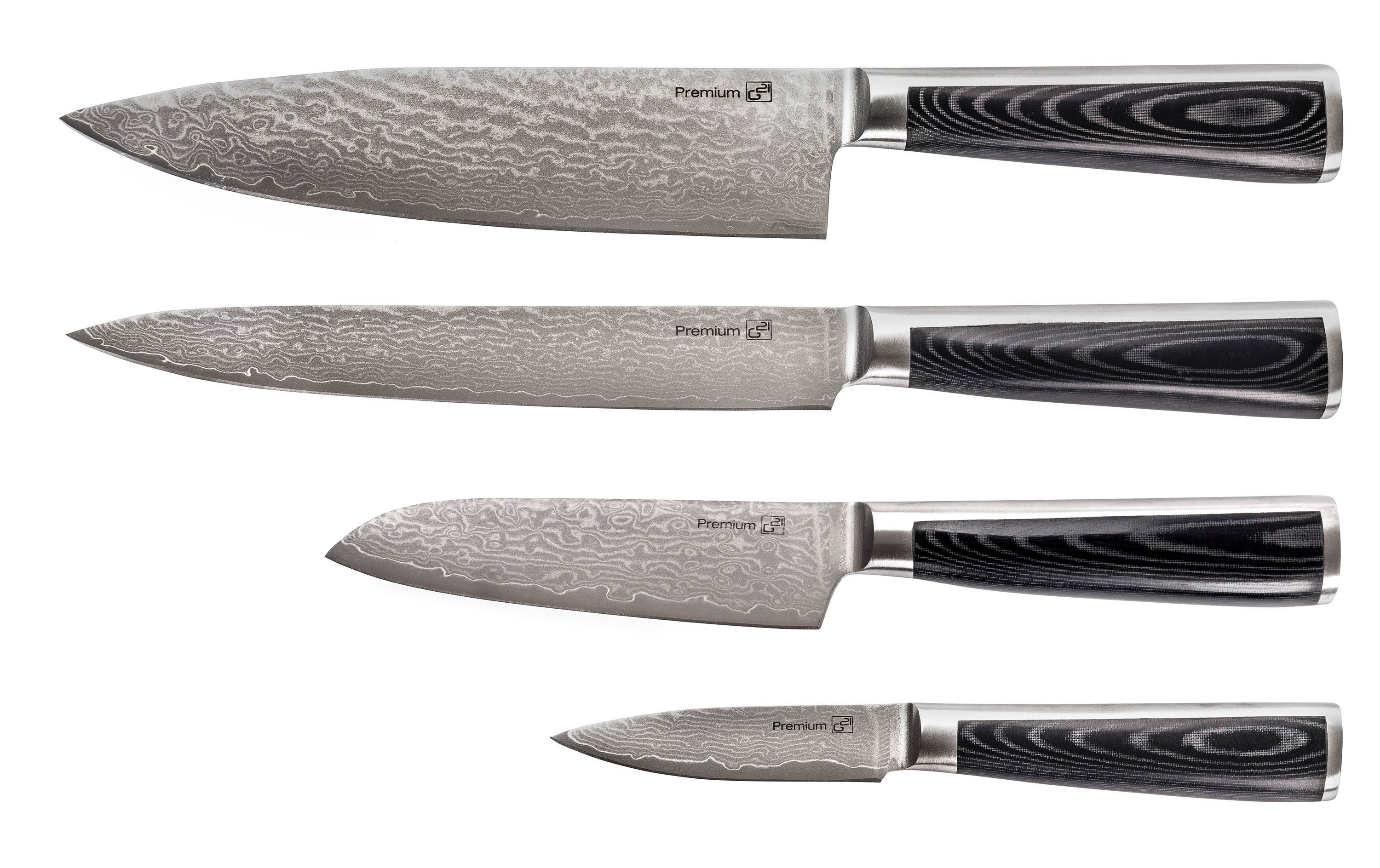 Sada nožů z damaškové oceli v kuchyni je skvělou volbou. Damascénská ocel má vyšší tvrdost a odolnost vůči opotřebení, díky vzácné a unikátní kresbě oceli navíc získáte jedinečnou kombinaci krásy a luxusu s vynikajícími řeznými vlastnostmi. V sadě najdete nůž šéfkuchaře a krájecí nůž s délkou 20 cm, Santoku nůž s délkou 13 cm a jeden univerzální nůž s čepelí o délce 9 cm. Dále pak bambusový blok pro bezpečné ukládání nožů a brusný kámen se zrnitostí 1000/6000 s vodítkem.