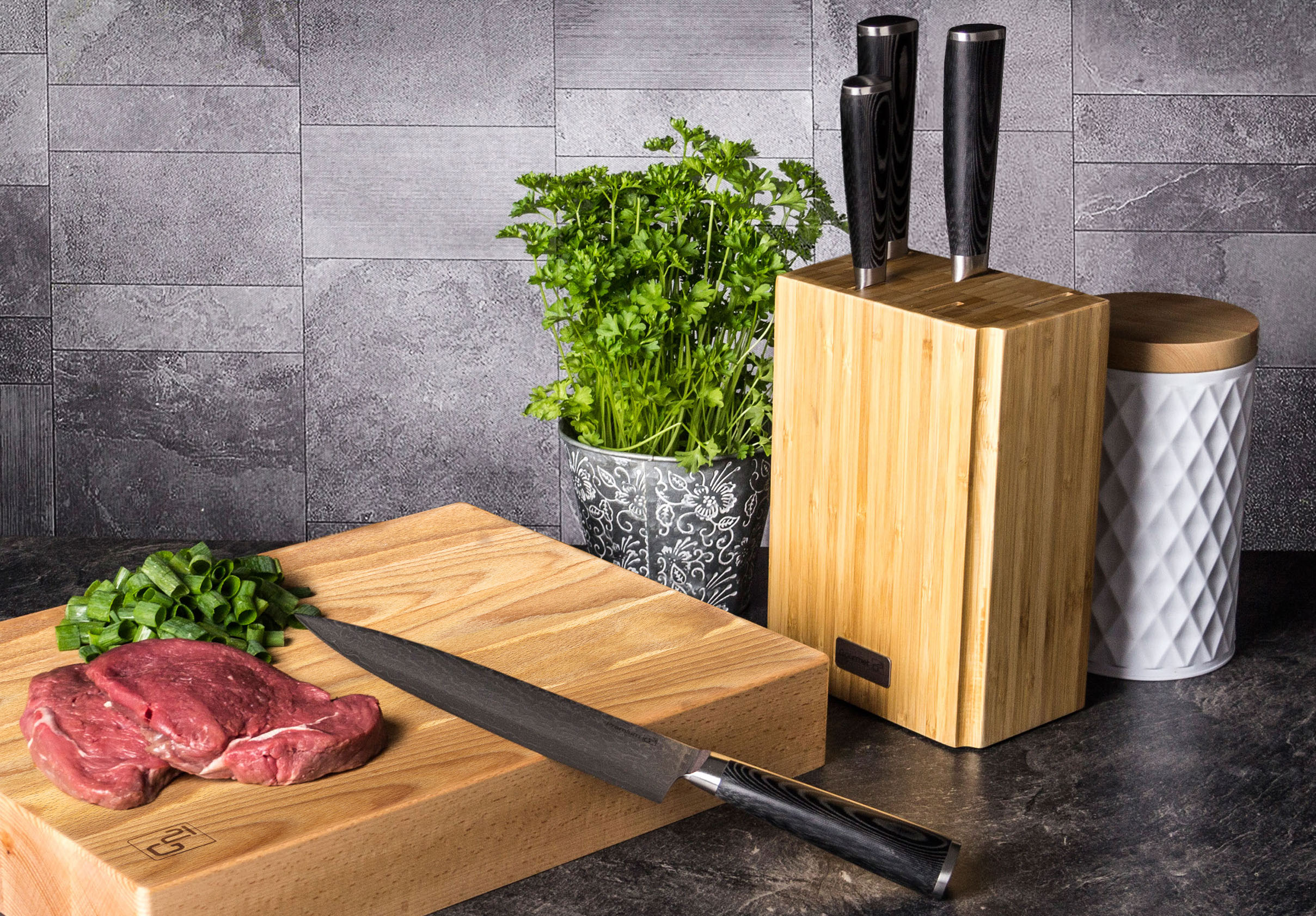 Designový stojánek na nože je vyroben z ekologického bambusového dřeva. Dřevo je nejlepším materiálem pro uskladnění nožů. Ostří nožů se při klouzání po dřevě netupí tak, jako je tomu u jiných tvrdších materiálů. Ve stojánku má každý z nožů své bezpečné místo. Správnou péčí o nože a jejich ukládáním do speciálního dřevěného bloku prodloužíte životnost nožů.