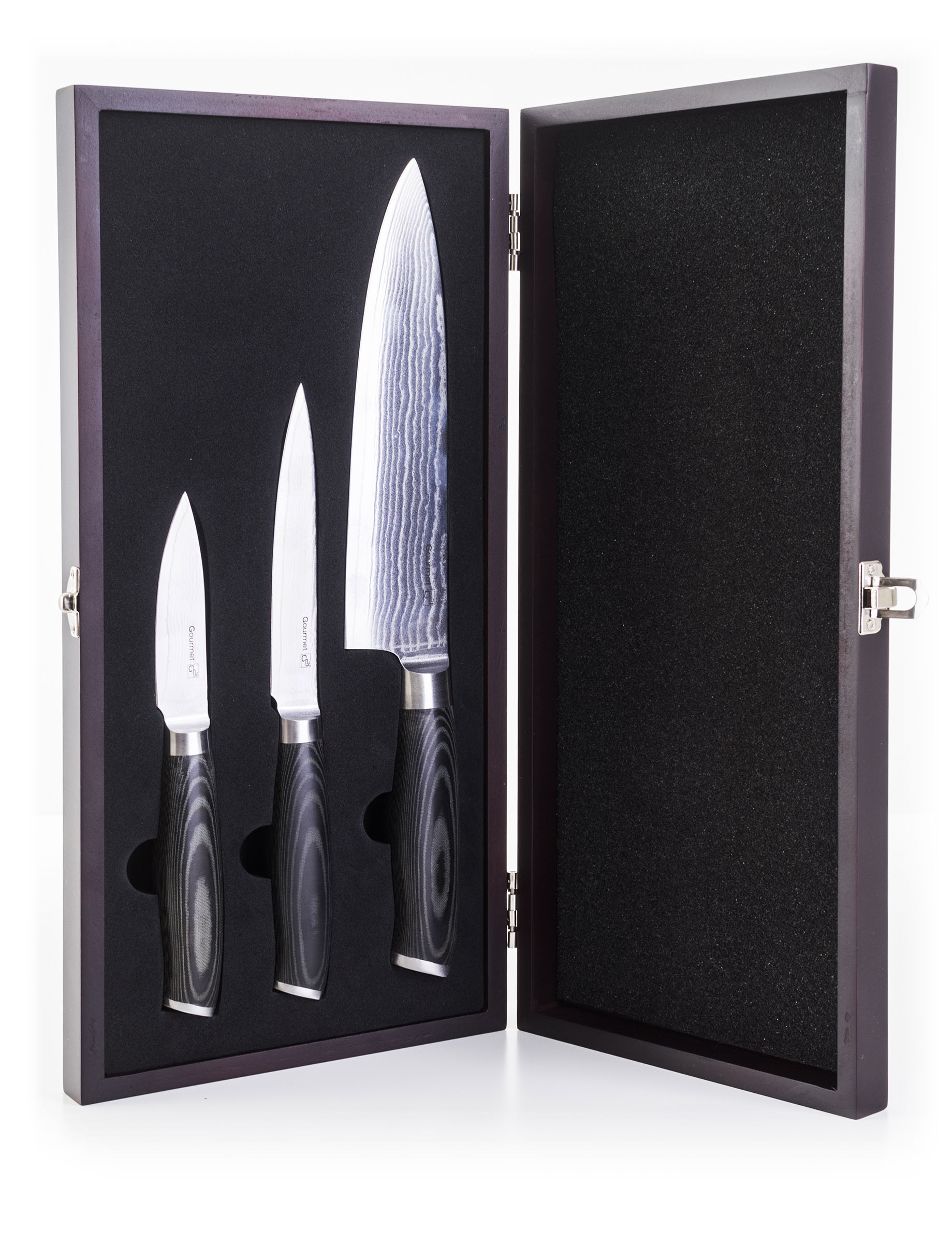 Sada čtyř vysoce kvalitních nožů G21 Gourmet Damascus z damascénské oceli s vámi bude krájet, ořezávat i porcovat. Z běžného vaření vytvoří zábavu, kterou ocení každý správný kuchař i nenasytný strávník. V sadě najdete nůž šéfkuchaře s délkou 21 cm, univerzální nůž a Santoku nůž s délkou 13 cm a jeden univerzální nůž s čepelí o délce 9 cm. Dále pak bambusový blok pro bezpečné ukládání nožů a brusný kámen se zrnitostí 1000/6000 s vodítkem.