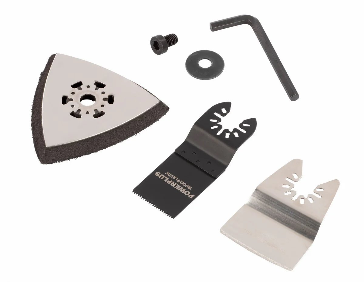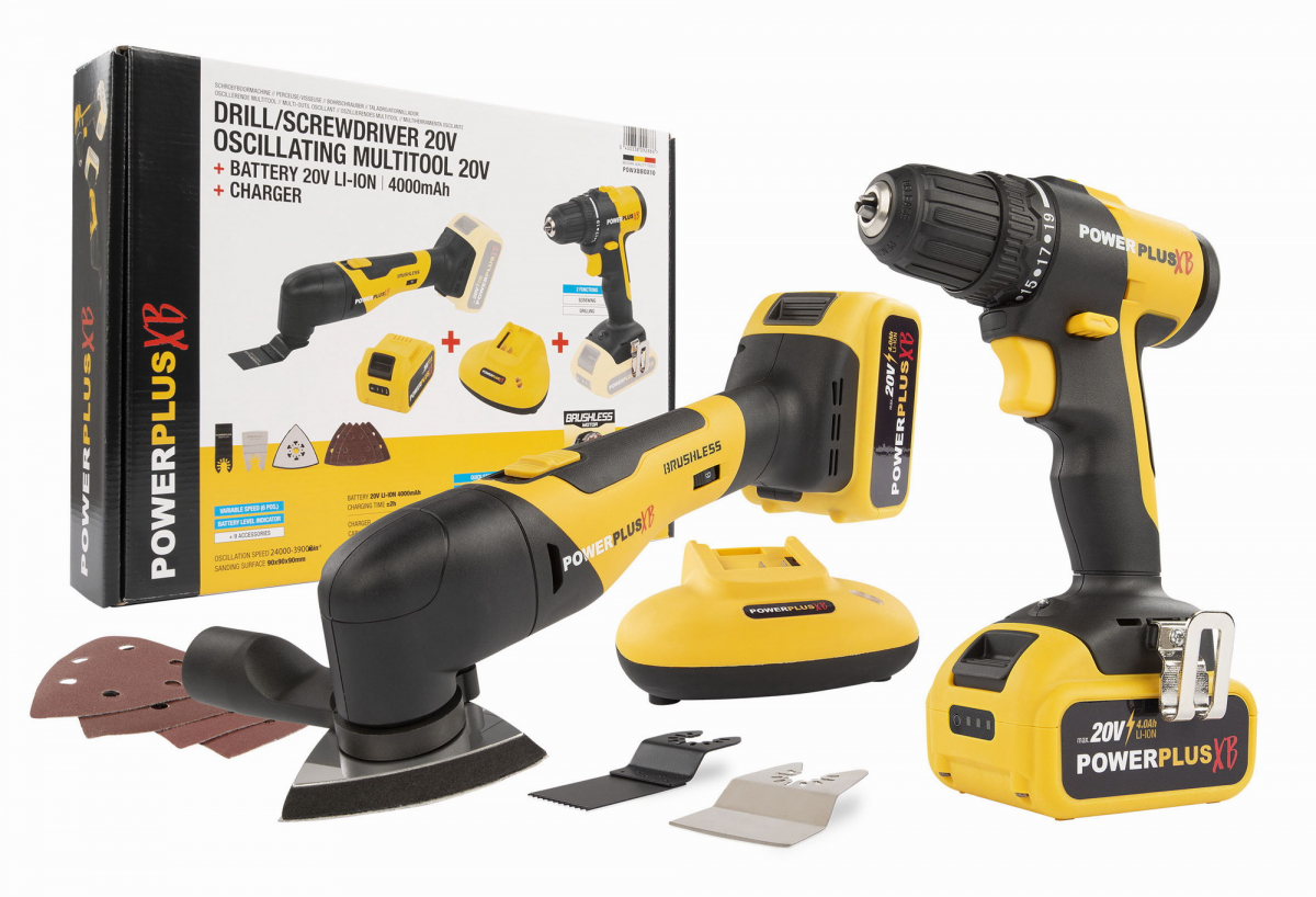 Sada obsahuje akumulátorový vrtací šroubovák, oscilační multifunkční brusku, nabíječku 20V a baterii 20V 4,0Ah.