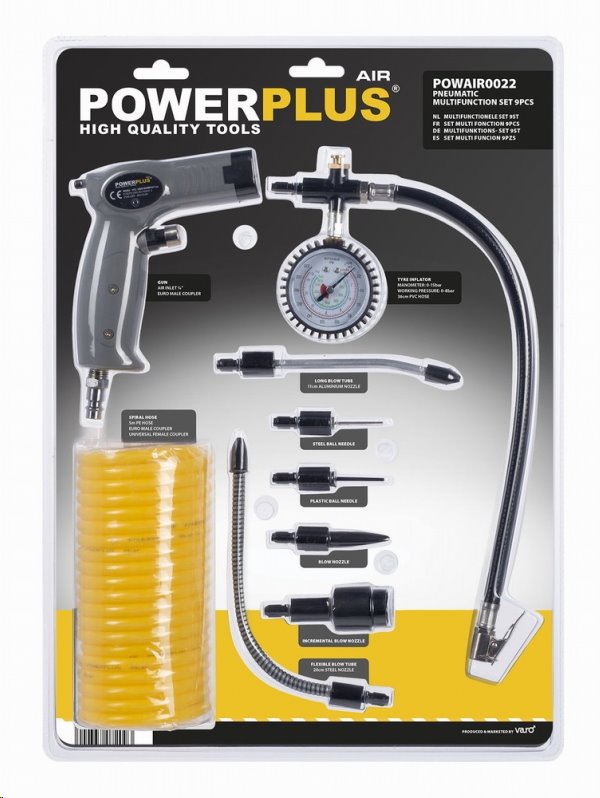 Praktická 9ks sada příslušenství PowerPlus POWAIR0022 k olejovým a bezolejovým kompresorům z řady POWX nalezne uplatnění v každé domácnosti, dílně či v garáži. Součástí této univerzální sady je pneumatická pistole s rychloupínacím systémem Quick and Easy, 5m polyethylenová vzduchová hadice, 20cm flexibilní hadice, nástavec s manometrem na foukání pneumatik, 11cm hliníkový nástavec a 4 nástavce na míče, nafukovací kruhy či na lehátka. S touto 9dílnou pneumatickou sadou vás už nikdy nic nezaskočí, jelikož máte vše potřebné po ruce.