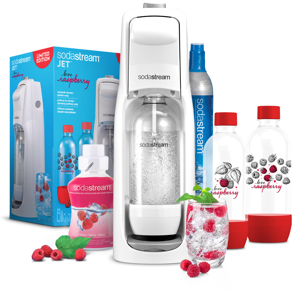Limitovaná edice Love Raspberry je výrobník domácí perlivé vody s prémiovou výbavou, laděnou do malinové tématiky. V tomto limitovaném balení naleznete nejprodávanější výrobník JET White, 1 lahev o objemu 1 litr a 2x 1 l lahev Jet s malinovou tématikou, originální malinovou příchuť pro perlivou vodu a bombičku s potravinářským CO2 plynem pro výrobu až 80 litrů perlivé vody.