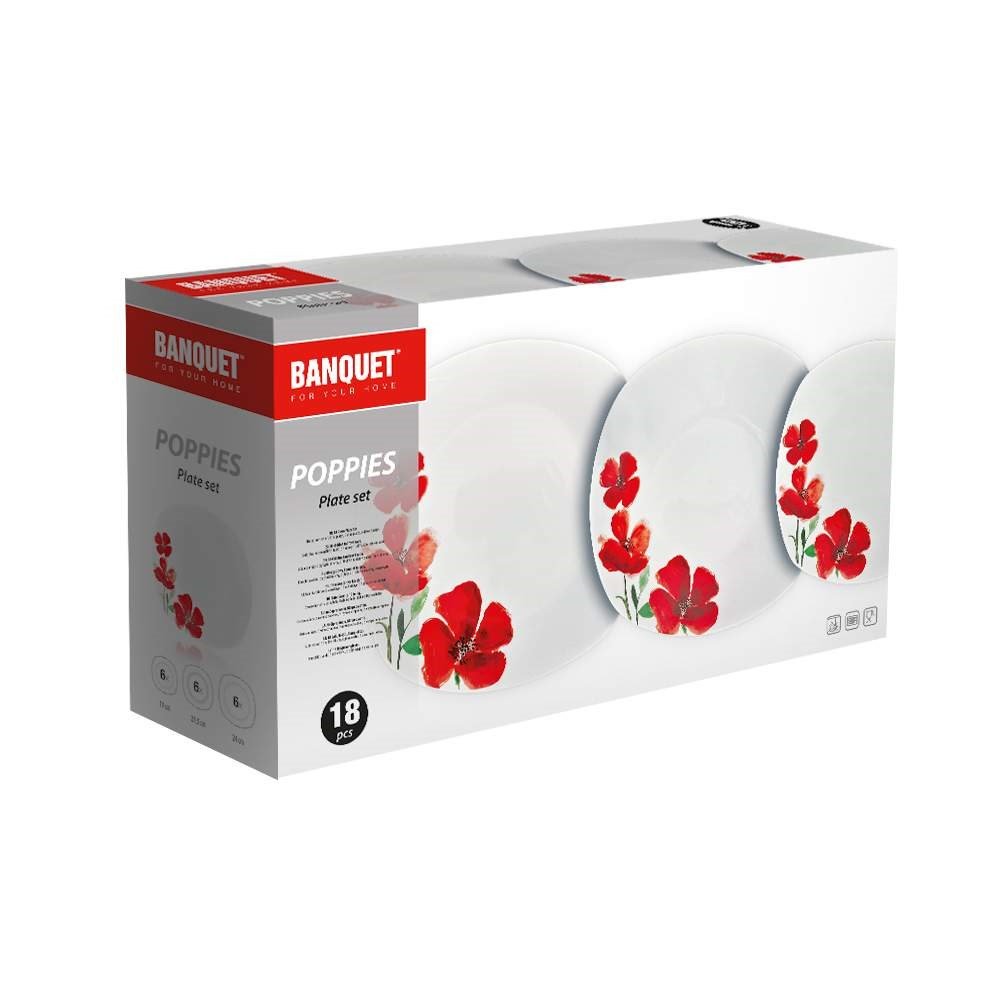 Potřebujete do své kuchyně nové nádobí? Jídelní sada Poppies od značky Banquet se vyrábí z kvalitního porcelánu. Na pohled nádobí vypadá velmi hezky a doplní design každé kuchyně. Díky sadě naservírujete připravené jídlo až pro 6 členů rodiny najednou. Talíře jsou ideální pro každodenní používání a také vhodné do mikrovlnné trouby i do myčky nádobí.