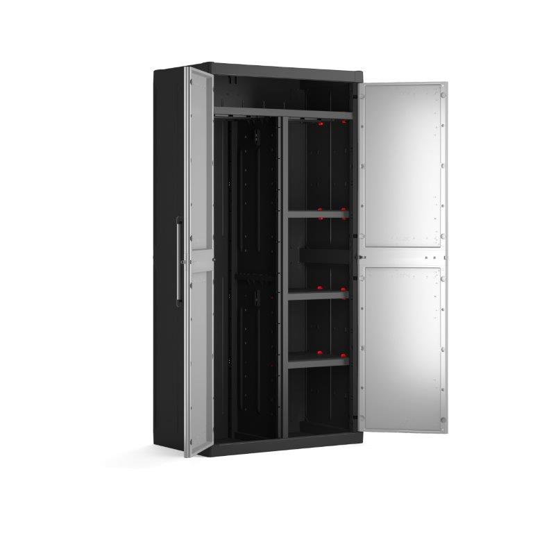 Skříň obsahuje celkem 4 přídavné police - každá s výraznou nosností až 15 kg, které přijdou vhod pro výrazně těžší předměty všeho druhu. Lze ji tedy využít pro skladování dílenského nářadí či zahradnických potřeb, například pro uložení náčiní s dlouhou násadou, které by se jinam nevešlo. Díky svému provedení v neutrální šedé barvě zapadne do každého prostoru bez ohledu na jeho konceptuální styl.