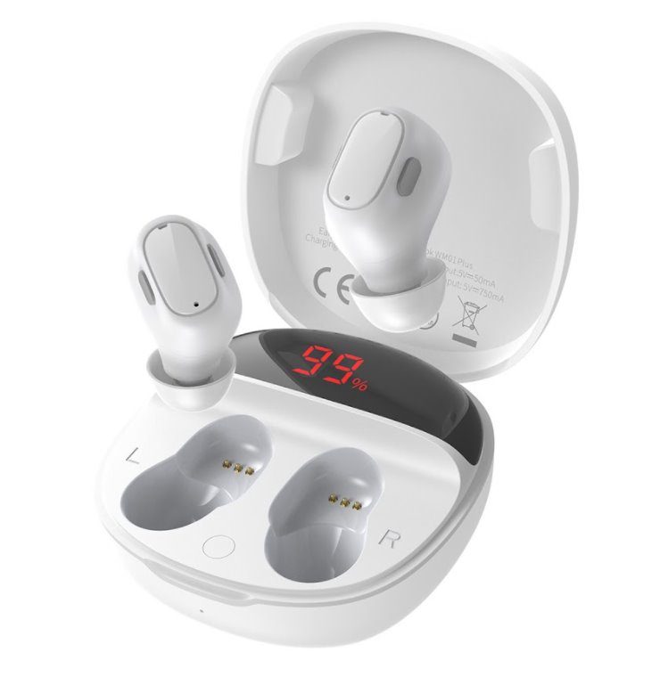 Baseus Encok WM01 Plus špuntová sluchátka v nabíjecím pouzdře, které je vybaveno displejem s přesným stavem nabití baterie.