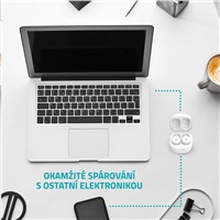 Špunty začnou hledat tvůj telefon nebo jiný zdroj, hned jak je vyndáš z pouzdra. Než si je nasadíš, už jsou ready hrát.
