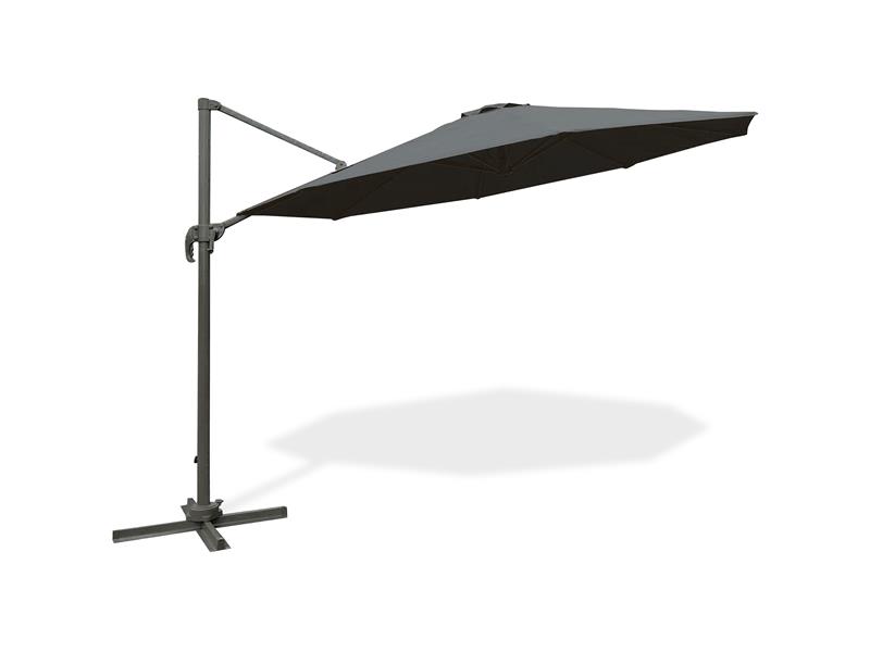 Závěsný slunečník o průměru 3 m Antracitový potah z 100% polyesteru 180 g Materiál: hliník /ocel/polyester 8 ocelových žeber 13 × 22 mm Možnost otočení o 360 st. dle potřeby Možnost nastavení úhlu sklonu Průměr hliníkové tyče 4,8 cm Pro venkovní použití