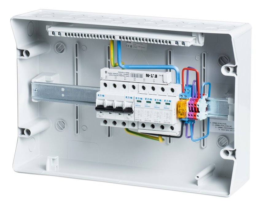 V rozvaděči je osazen svodič přepětí AC T1+T2, jistič B32/3 pro jištění vstupu do střídače a jistič B2/1, který jistí PATICI/RELE Finder, které zajišťuje N0% pro splnění podmínek distribucí (součástí je jak NC, tak NO kontakt a střed). Tím je zajištěno použití pro všechny typy měničů na trhu.