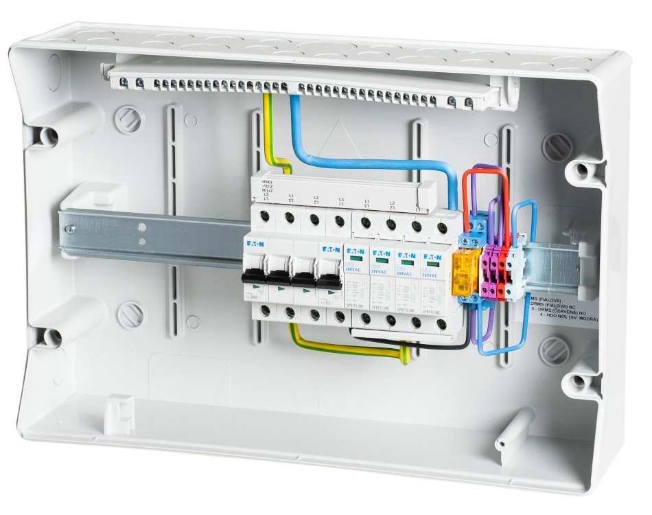 V rozvaděči je osazen svodič přepětí AC T1+T2, jistič B40/3 pro jištění vstupu do střídače a jistič B2/1, který jistí PATICI/RELE Finder, které zajišťuje N0% pro splnění podmínek distribucí (součástí je jak NC, tak NO kontakt a střed). Tím je zajištěno použití pro všechny typy měničů na trhu.