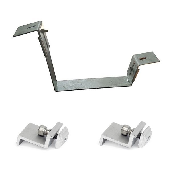 Držák solárního panelu včetně 2 svěrek pro jeho upevnění. Každý instalovaný panel potřebuje 4 držáky, ale panely v sousední řadě držák sdílejí viz schéma v příloze. Sklon panelů je cca 10°.