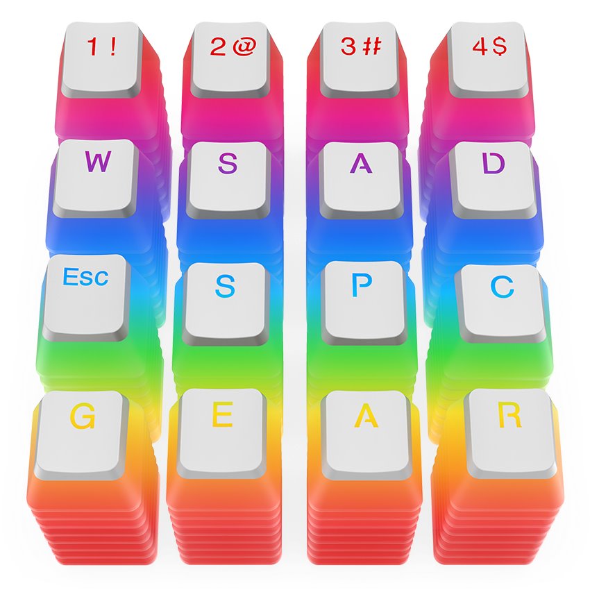 Set skládající se ze 104 kláves v průhledném dvouvrstvém stylu. PBT materiál zajistí komfort při každodenním používání i dlouhodobou odolnost proti opotřebení. Klávesy jsou kompatibilní s většinou spínačů jako jsou Cherry MX, Kailh, Gateron a Outemu. Součástí je i sada tlumících gumových kroužků nainstalovaných přímo na klávesách.