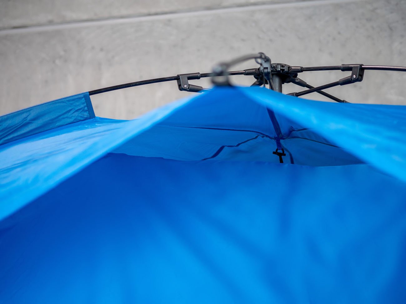 Stan Acra jednoduše vyndáte z obalu a uchopíte ho za vrchní spojovací díl. Pomocí pružných sklolaminátových prutů, které jsou spojené do jednoho celku, se sám sestaví. Vznikne tak otevřený přístřešek. Ložnici poté zavěsíte na konstrukci stanu. Nohy napnete pomocí kolíků, ukotvíte upínací šňůry a rovnou stan využijete k odpočinku.