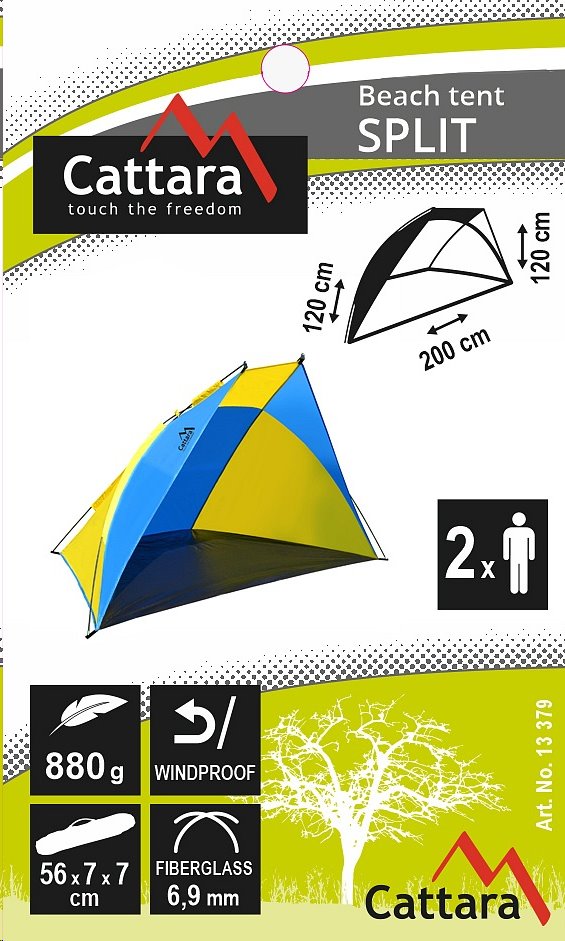 Plážový přístřešek Cattara SPLIT o rozměrech 200 x 120 x 120 cm nabízí praktickou plochu třeba pro opalování s hlavou schovanou ve stínu. Na podlážku stačí jen položit osušku a můžete si užívat odpočinku.