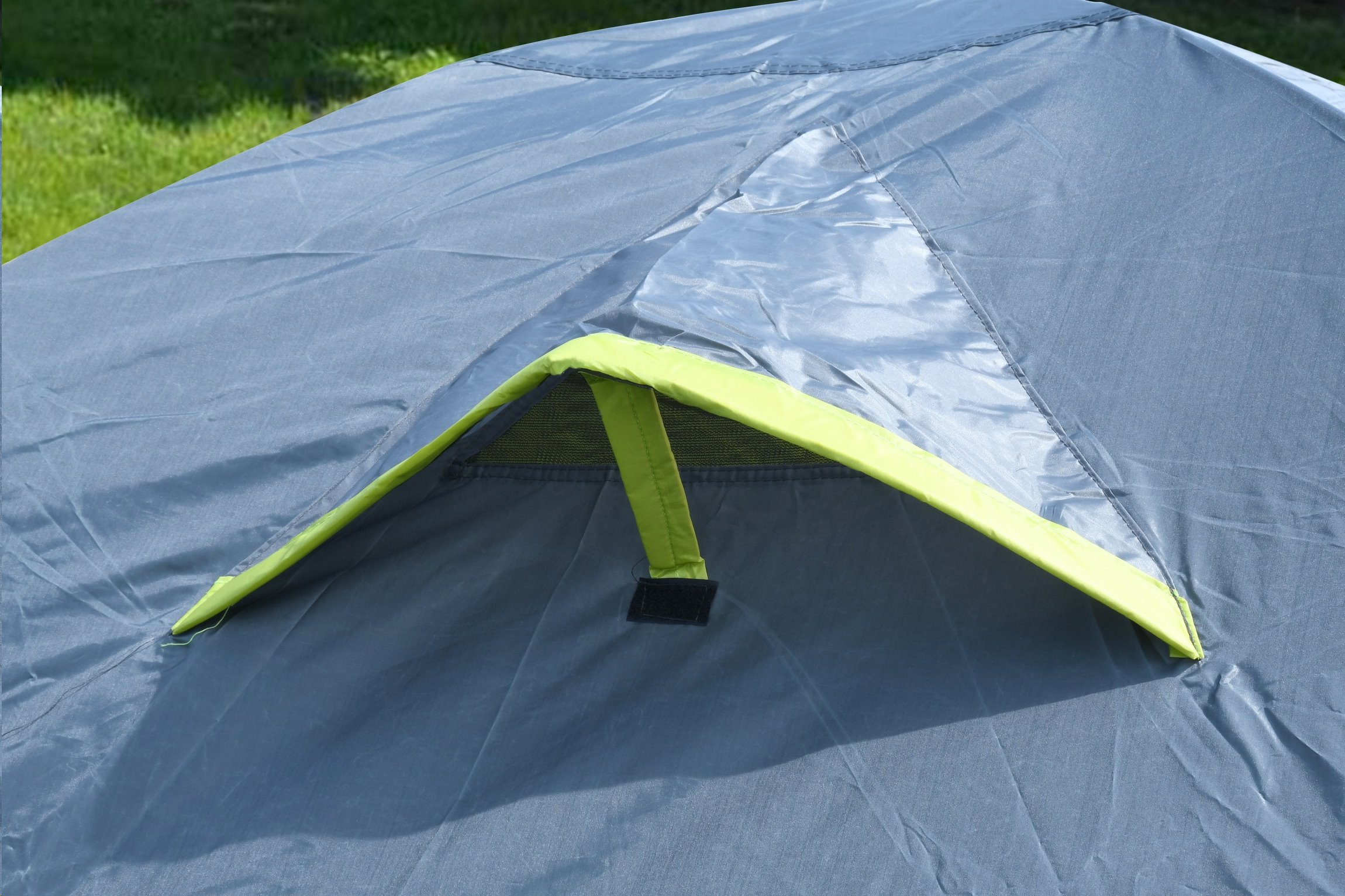 Optimální cirkulaci vzduchu zajistí ventilační okénko umístěné na zadní straně střechy stanu. Okénko se síťkou je vybaveno sklopnou vzpěrou, s jejíž pomocí lze snadno nastavit výšku stříšky. Další síťované okénko je umístěno v předsíňce.