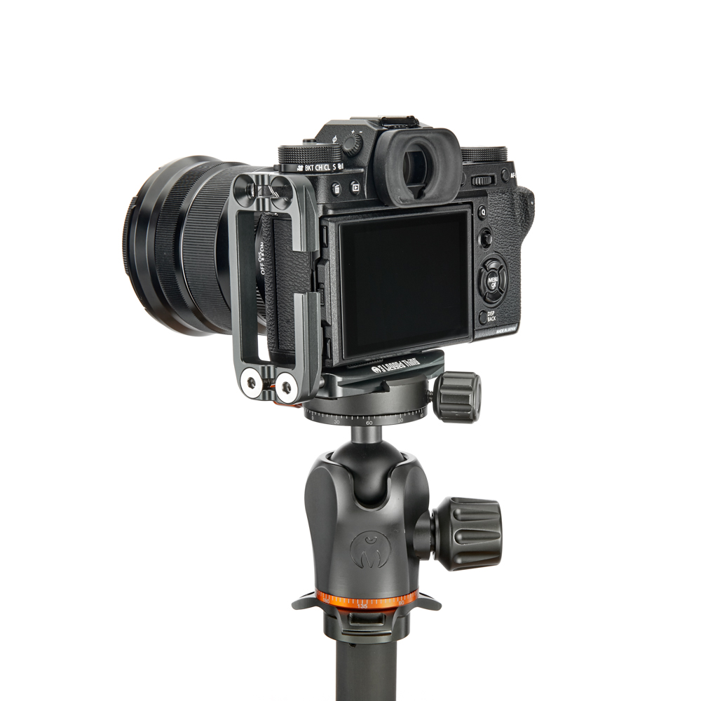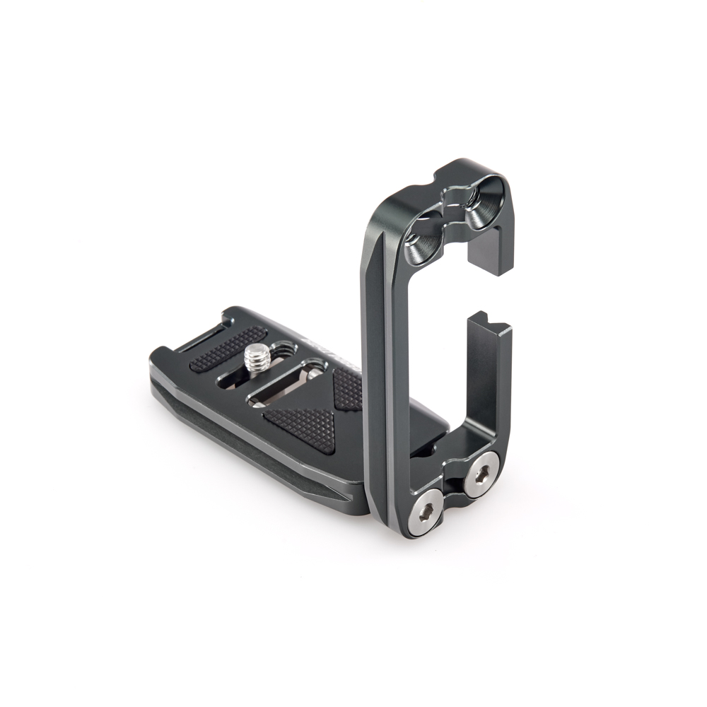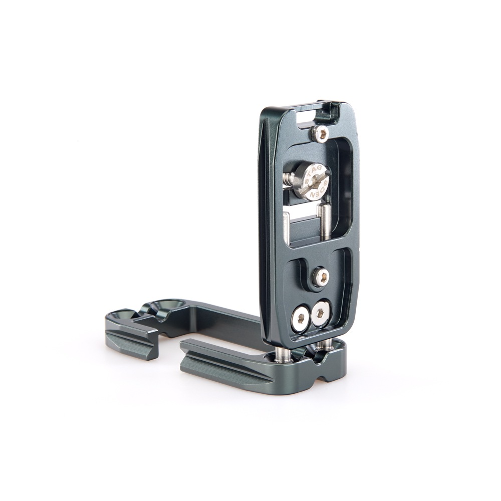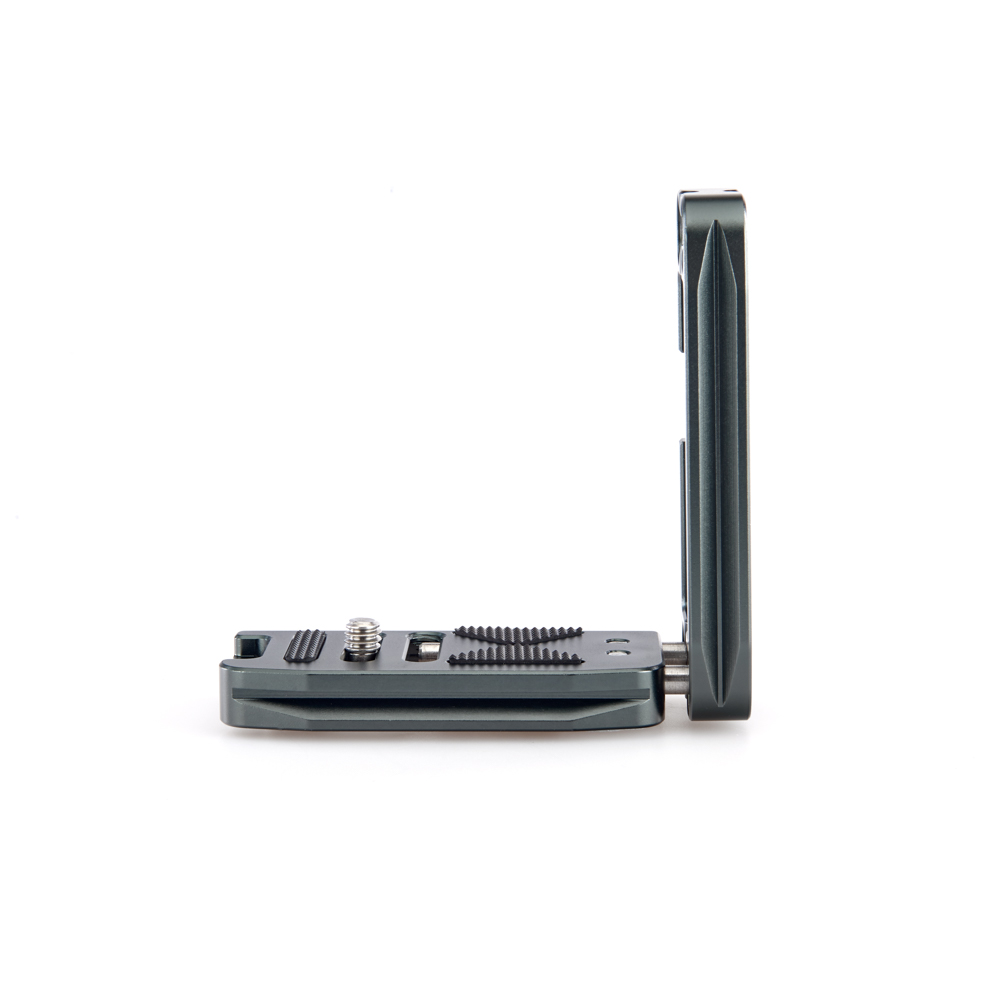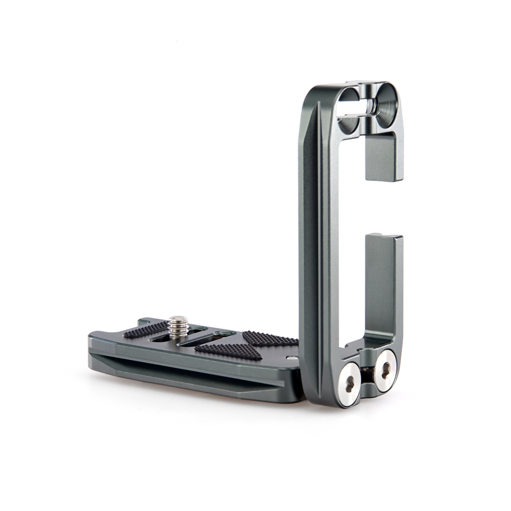 Délku držáku lze nastavit až do 113 mm pomocí 2 tuhých posuvných tyčí a šroubů z nerezové oceli, které si uživatel pomocí dodaného nástroje zafixuje na svém místě. Zadní hrana základny je zkosená pro lepší přístup k výklopnému displeji fotoaparátu. Svislá součást je obrobena tak, aby neblokovala porty fotoaparátu, a navíc může být namontována naopak, aby bylo možné připojit kabely z pravé nebo levé strany. Boční desku navíc velice snadno připevníte vzhůru nohama, čímž přetvoříte L-Bracket na kolébkový držák pro vaši kameru.