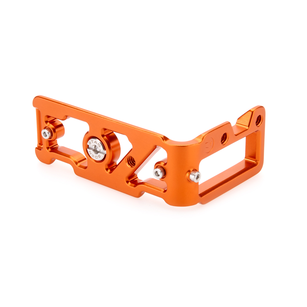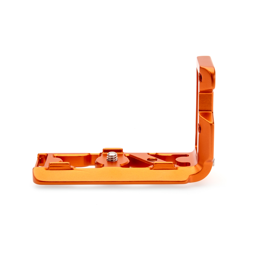 Délka držáku činí 100 mm a zadní hrana základny je zkosená pro lepší přístup k výklopnému displeji a k dalším důležitým funkcím fotoaparátu. Svislá součást je obrobena tak, aby neblokovala porty či bateriová dvířka fotoaparátu, a navíc může být namontována naopak, aby bylo možné připojit kabely z pravé nebo levé strany. Zároveň k destičce můžete připnout popruh, a to pomocí 1/4″ závitu nebo integrovaného očka.