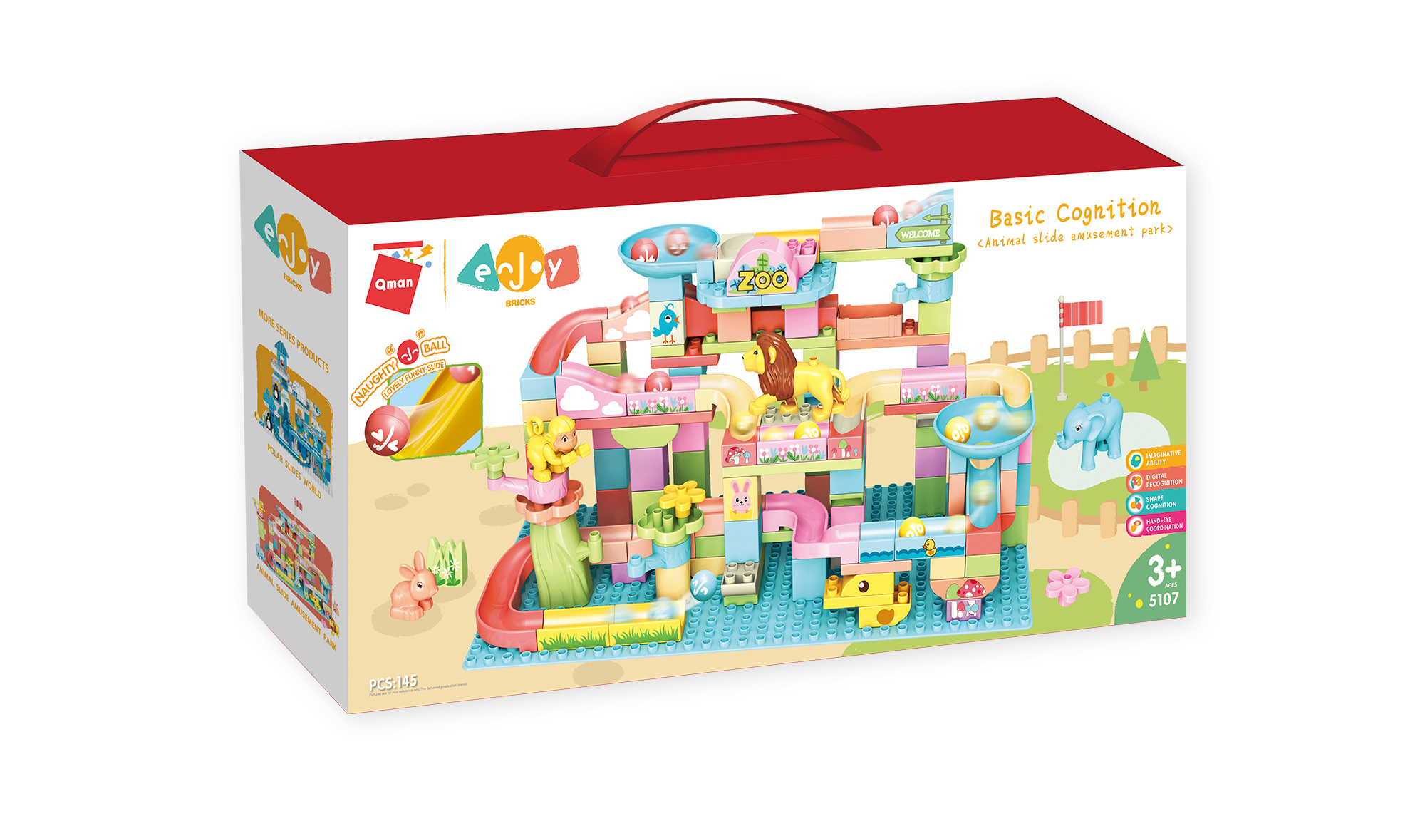 Stavebnice kuličkové dráhy s motivy safari od značky Qman. Rozvíjí dětskou fantazii, rozpoznávání tvarů i koordinaci rukou a zraku. Baleno v krabici s uchem pro nadné přenášení. Stavebnice je kompatibilní s Lego, Sluban a dalšími stavebnicemi tohoto typu.