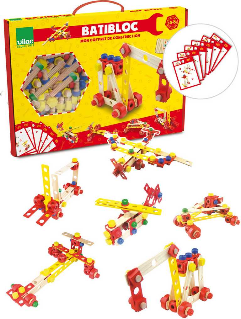 Vilac Batibloc je stavebnice vyrobená z masivního dřeva. Obsahuje 106 různých barevných i přírodních desek, šroubků, matic a nářadí, které pomáhají dětem rozvíjet jejich představivost. Balení také obsahuje šest stavebních návodů. Kompletní box, který je ideální jako první dřevěná stavebnice pro vaše dítko.