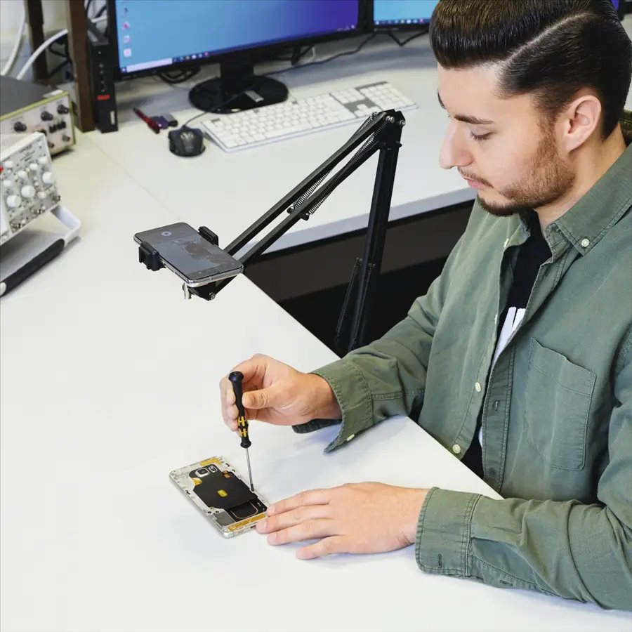 Nastavitelná šroubová svorka umožňuje připevnění k různým plochám. Držák mobilního telefonu je ideální pro neobvyklé úhly záběru a skvělé fotky. Polohu si můžete nastavit buď vertikální nebo horizontální, a přizpůsobit si ji tak svým potřebám díky 2 mimořádně flexibilních kloubů. Snadno si změníte úhel, polohu nebo úplně zařízení odsunut, aby vám nepřekáželo. Snadné přichycení k pracovní ploše pomocí šroubové svorky s filcem. Nehrozí tak poškrábání povrchu. Pružiny dodají stabilitu nastavené poloze kloubů.