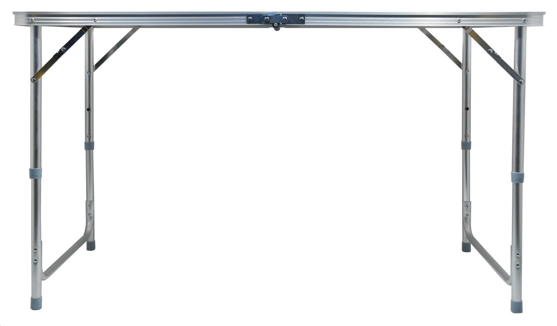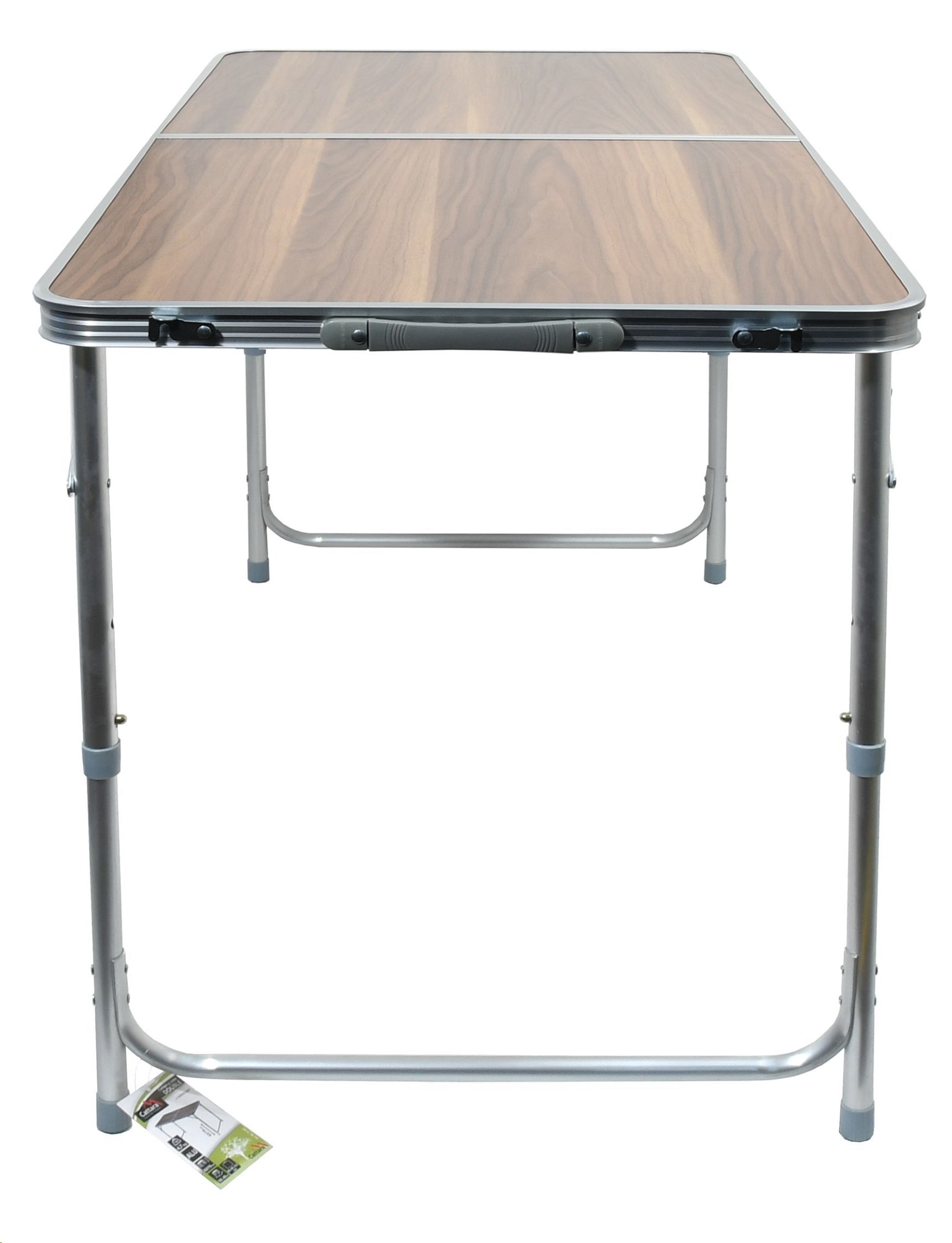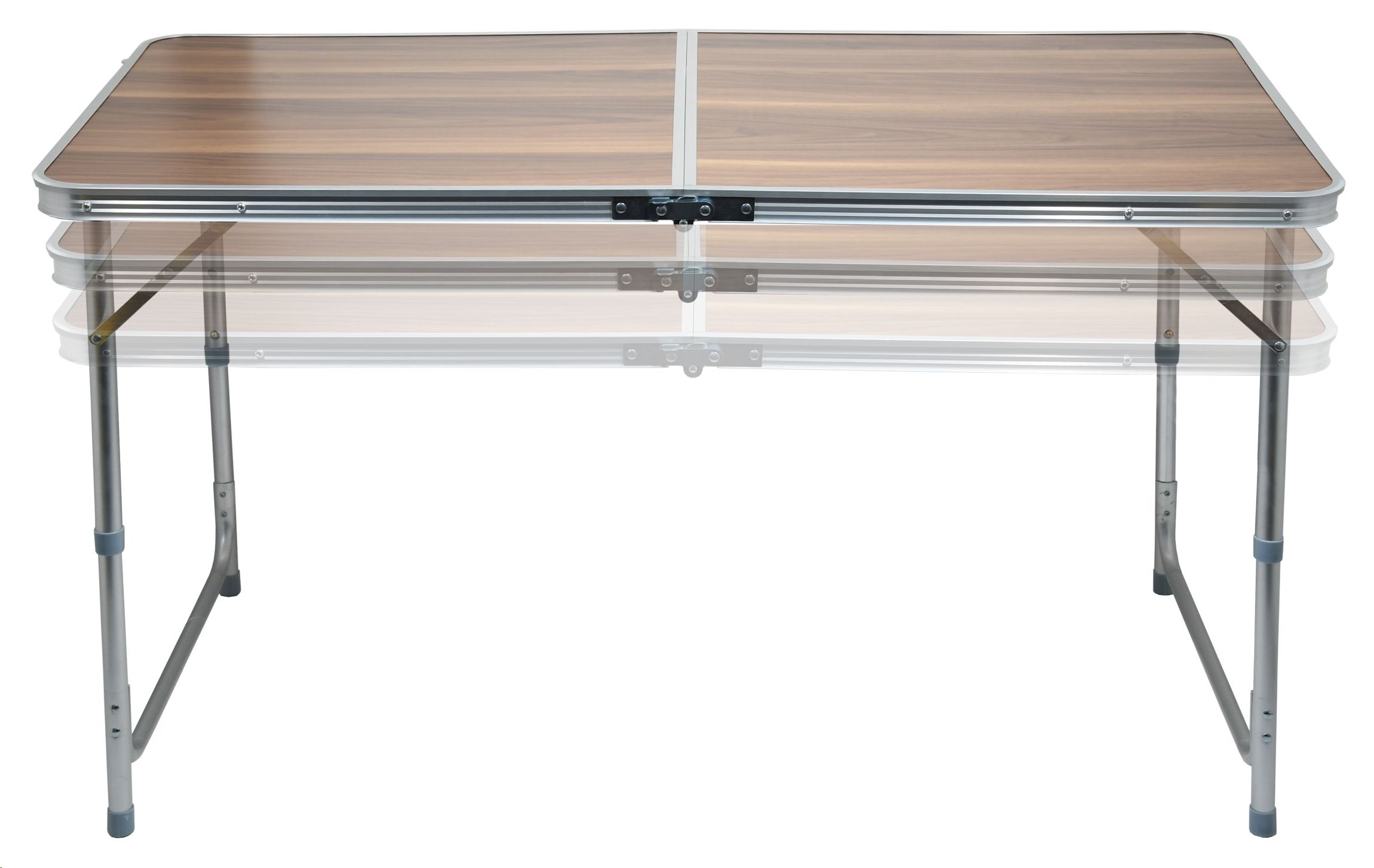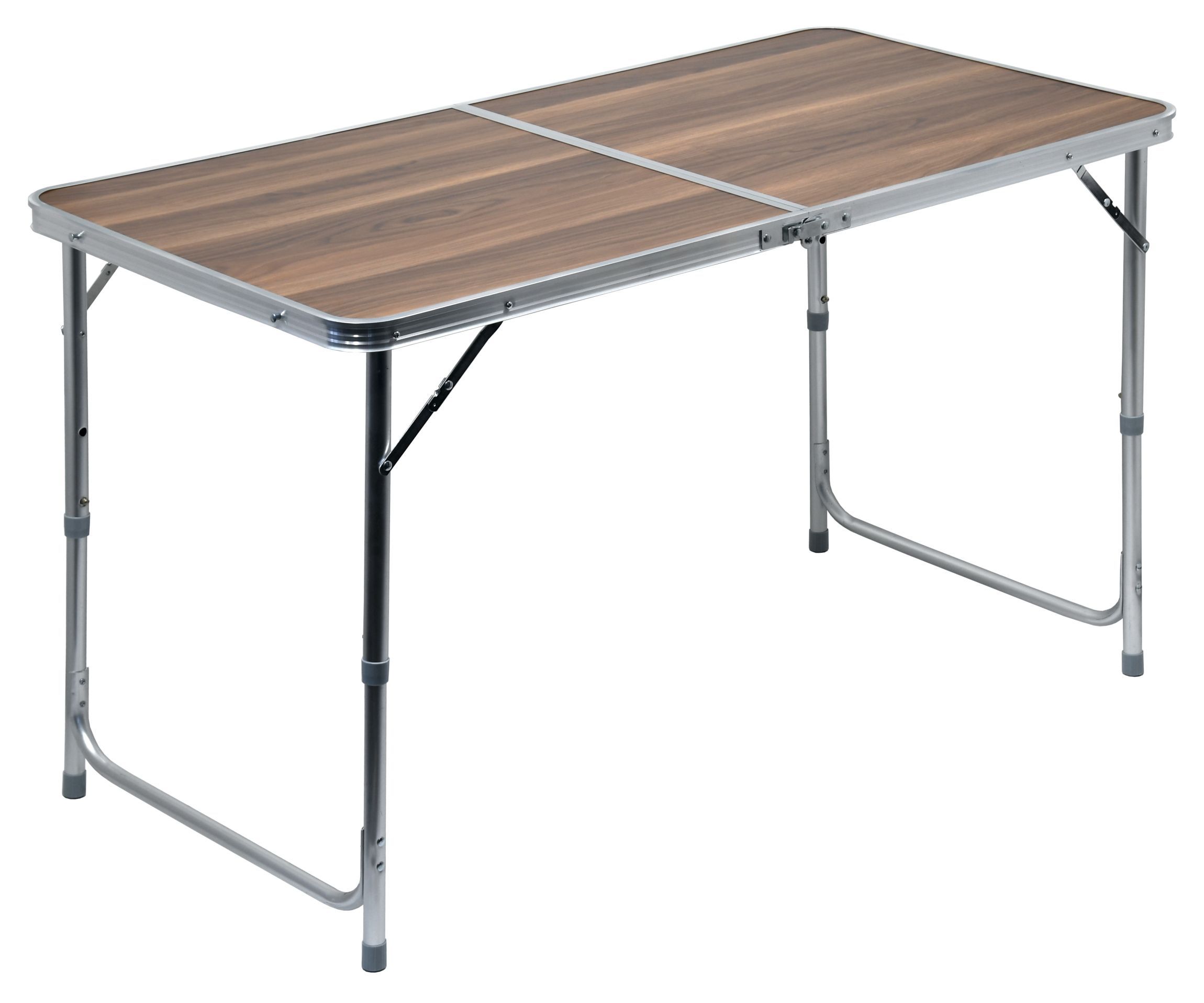 Stůl Double je kvalitní stůl z hliníku s rovnou a pevnou plochou se vzorem, který věrohodně imituje tmavé dřevo. Hliníkové skládací nohy stolu jsou opatřeny pojistkou, takže nehrozí samovolné složení. Bonusem je jejich teleskopické výškové nastavení ve dvou zajištěných a jedné krajní poloze, takže si můžete stolovat po svém.