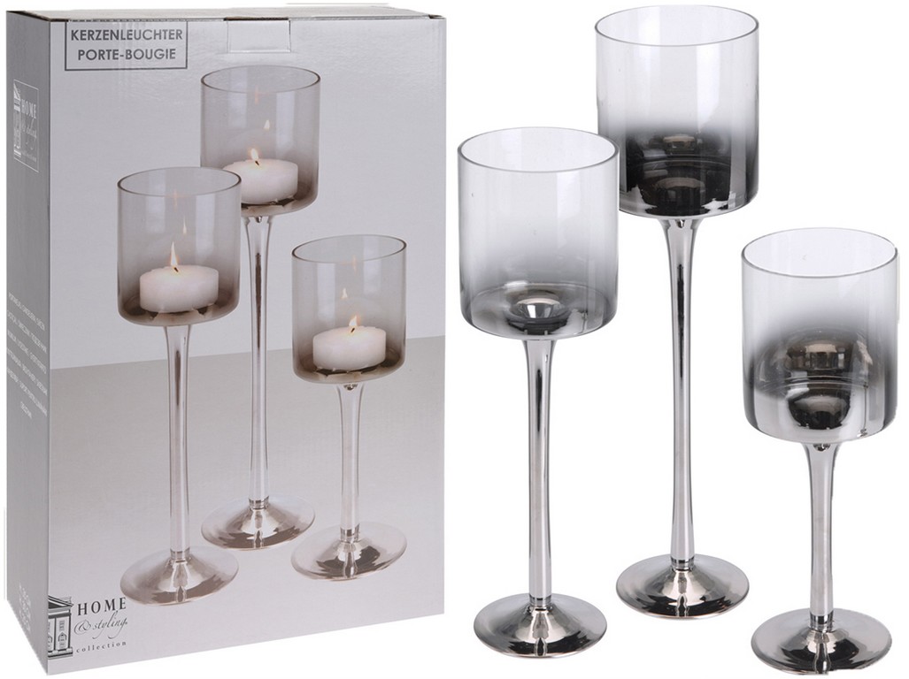 Sada M.A.T. Group 386614 obsahuje 3 vánoční svícny ve tvaru likérového poháru na stopce o výšce 25, 30 a 35 cm, které je možné použít na svíčky, květiny, různé aranže a jiné dekorační materiály všeho druhu. Jedná se o krásnou a velice výraznou domácí dekoraci ve stylu glamour, která přijde vhod nejenom pro vánoční výzdobu interiéru a na slavnostně prostřený stůl během štědrovečerní večeře, ale také v průběhu celého roku při různých oslavách a dalších příležitostech. Svícny jsou vyrobené z kvalitního skla s povrchovou úpravou, která tomuto výrobku dodává decentní černý podtón, což ještě více podtrhuje nádheru tohoto unikátního materiálu.