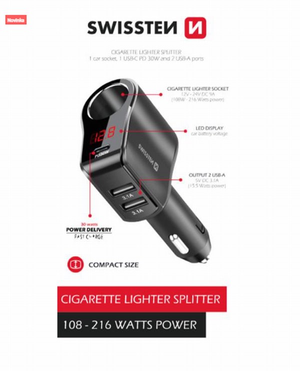 SWISSTEN AUTOADAPTÉR S VÝSTUPEM 1x CL, 1x UCB-C PD a 2x USB-A, 108W