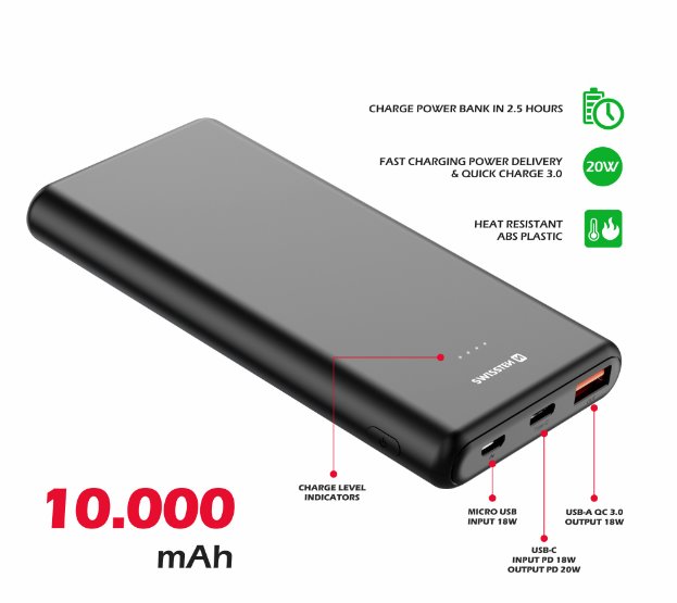 Powerbanka SWISSTEN s kapacitou 10.000 mAh se vstupy microUSB, USB-C a výstupy USB-A, USB-C a rychlým dobíjením PD i QC. Baleno v blistru SWISSTEN.