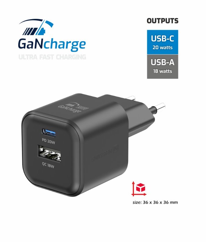 SWISSTEN SÍŤOVÝ ADAPTÉR GaN 1x USB-C 20W PD + 1x USB-A 18W QC ČERNÝ