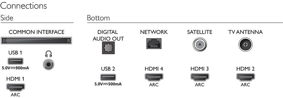 Rozhraní: Wi-Fi, Bluetooth, 4x HDMI, 2x USB 2.0, 1x CI+ slot, 1x optický audio výstup, 1x sluchátkový výstup, 1x RJ-45, 1x RF vstup, 1x LNB vstup