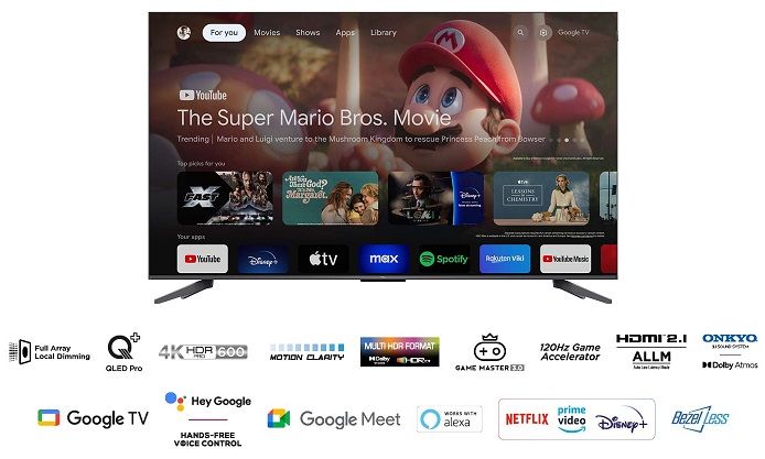 Televize Google TV, QLED, 139cm, 4K Ultra HD, 50Hz, HDR10, HDR10+, HLG, Dolby Vision, lokální stmívání, DVB-T2/S2/C, H.265/HEVC, 3× HDMI, 1× USB, CI+, LAN, WiFi, Bluetooth, DLNA, Chromecast, Miracast, hlasové ovládání, Google Assistent, Amazon Alexa, párování s mobilním zařízením, VESA 400×300, Dolby Atmos, DTS HD, Prostorový zvuk, DTS:X, DTS Virtual: X, en. třída F