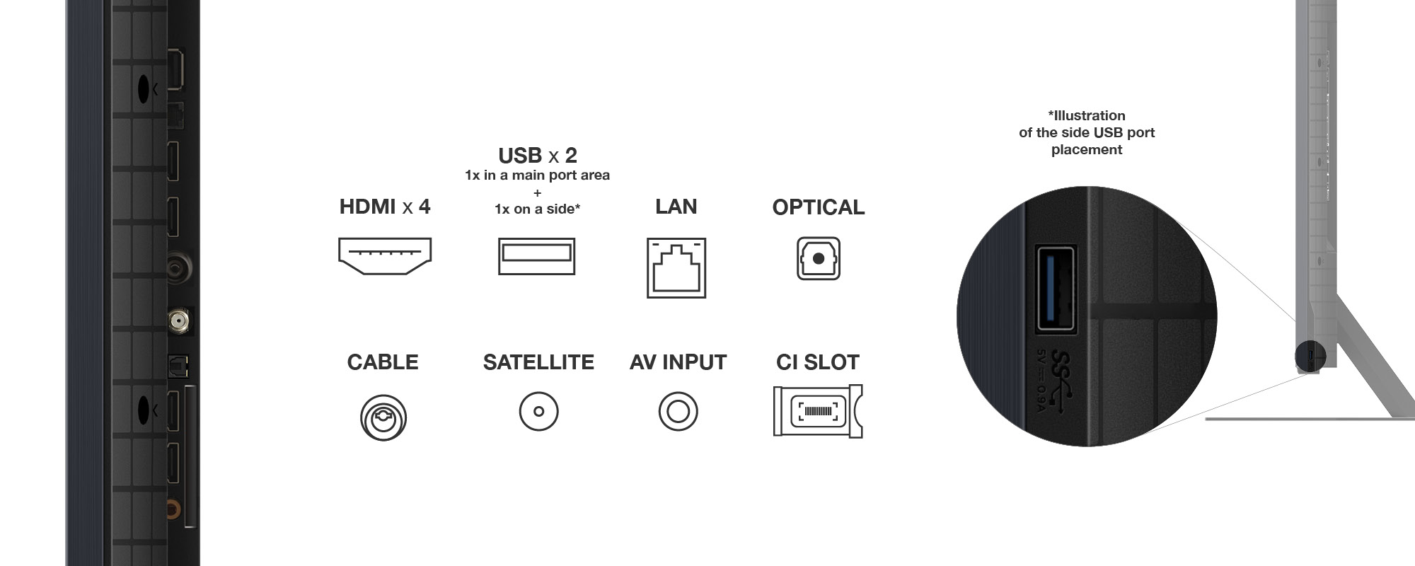 H.265/HEVC, 4× HDMI, 2× USB, CI+, LAN, WiFi, Bluetooth, DLNA,