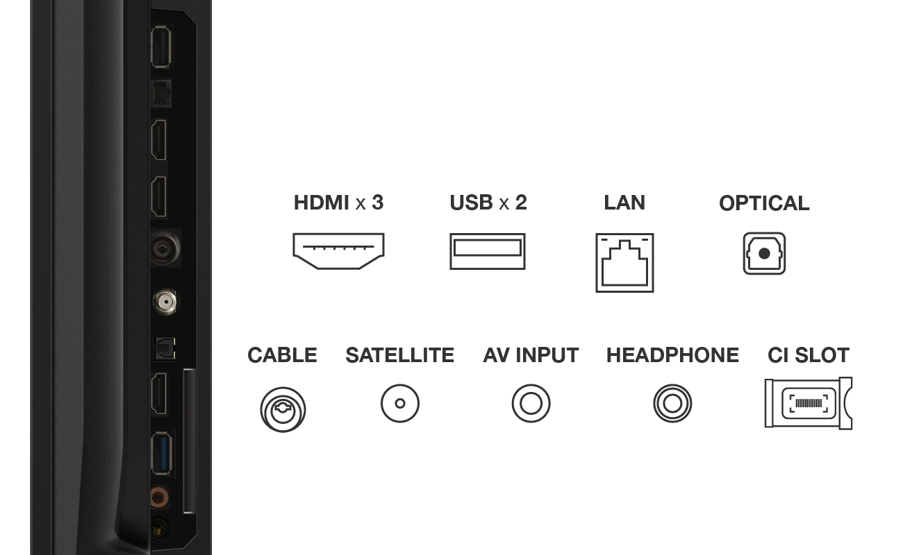 HDR10, HLG, DVB-T2/S2/C, H.265/HEVC, 3× HDMI, 2× USB, CI+, LAN,