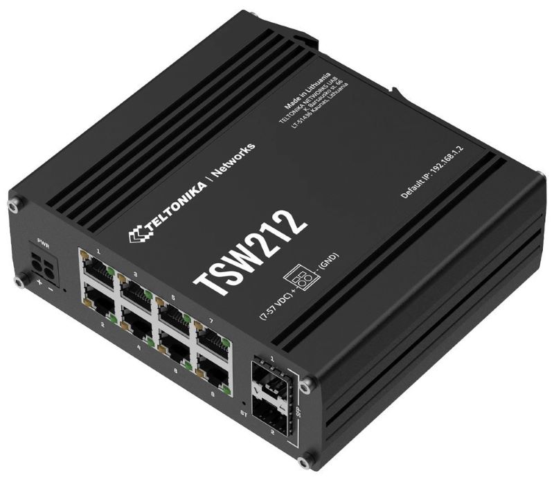 Průmyslový managed switch Teltonika TSW212 od společnosti Teltonika Networks je je řízený ethernetový přepínač L2 Teltonika Networks s dalšími funkcemi L3, jako je podpora klientů DHCPv6 a statické směrování IPv6 pro lepší správu sítě. Tento přepínač podporuje několik průmyslových protokolů, včetně EtherNet/IP, PROFINET a MRP, a má 8 gigabitových ethernetových portů a 2 porty SFP, které zajišťují robustní komunikaci na velké vzdálenosti po optických vláknech. TSW212 je zasazen do robustního hliníkového pouzdra a vyniká odolností vůči extrémním teplotám a silným vibracím - to vše při snadné instalaci díky integrovanému držáku na lištu DIN.