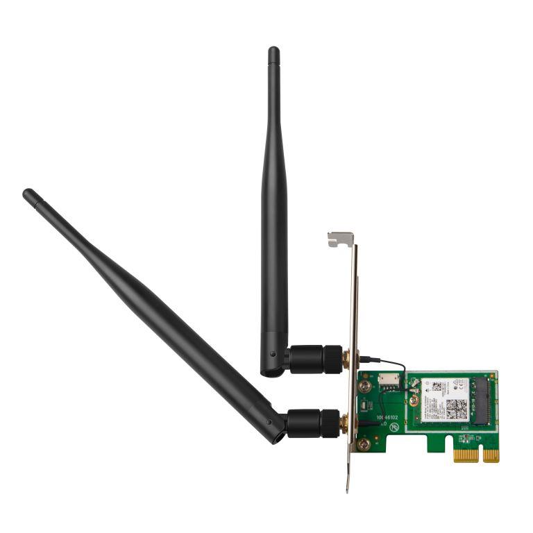 Bezdrátový Wi-Fi PCI Express adaptér s Wi-Fi 6 a Bluetooth 5.0. Rychlost AX3000 až 2976 Mb/s, 802.11ax/ac/a/b/g/n, 2x odnímatelná anténa 5 dBi, MU-MIMO, zabezpečení WPA3-SAE, 64/128bit WPA/WPA2-PSK, (2,4GHz 574Mb/s + 5GHz 2402 Mb/s), 1024QAM, Windows 10, BLT 5.0/4.2/4.0, PCIe, autoinstalace.