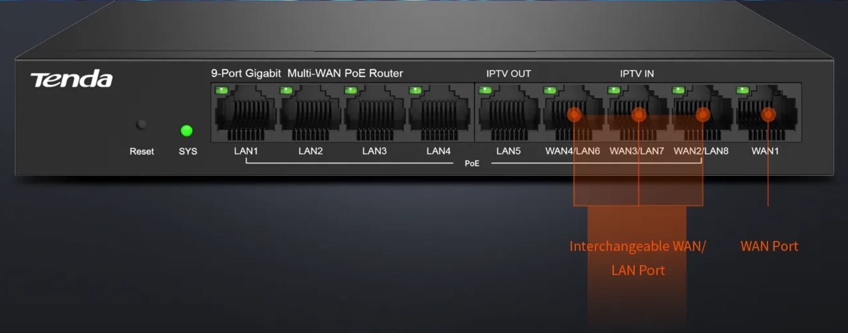 Porty: 9x Gigabit Ethernet (1x WAN, 5x LAN, 3x WAN/LAN)