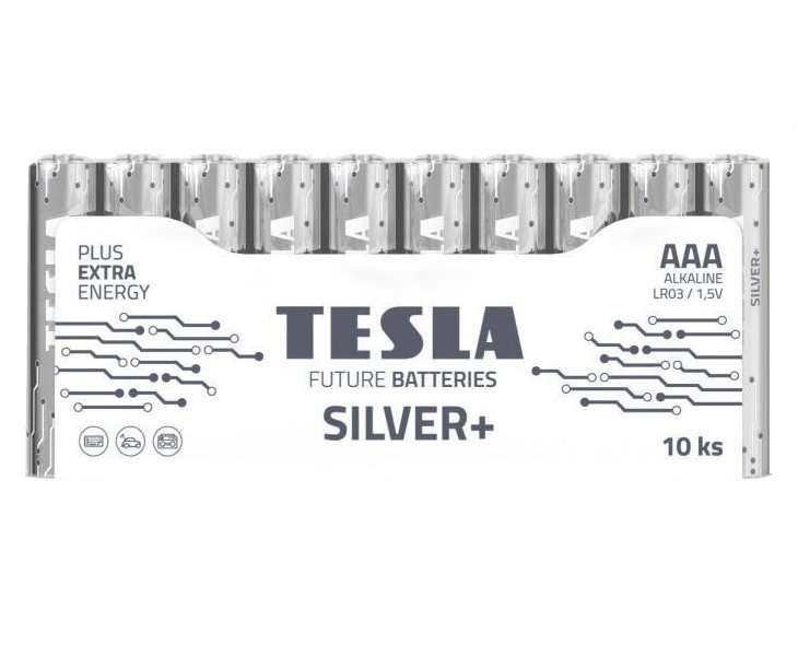 Alkalické baterie formátu AAA s napětím 1,5 V. Řada SILVER+ zahrnuje alkalické baterie určené pro přístroje s dlouhodobým vysokým odběrem elektrické energie. Představuje ideální volbu pro elektronické hračky. Tuto řadu specifikuje dlouhotrvající výdrž baterie při stálém energetickém zatížení. V jednom balení je 10 kusů baterií.