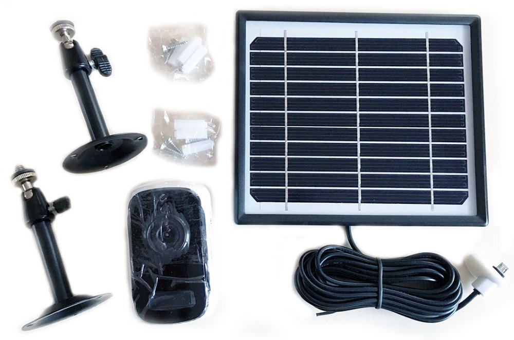 Součástí balení je 2x držák na stěnu, 2x sada hmoždinek a vrutů, 2x baterie a solární panel.