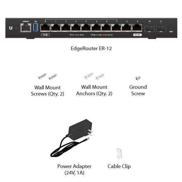 EdgeRouter 12 může být instalován do standardního racku 1U pomocí EdgeRouter rackové sadě ER-RMKIT, která je prodávána samostatně.