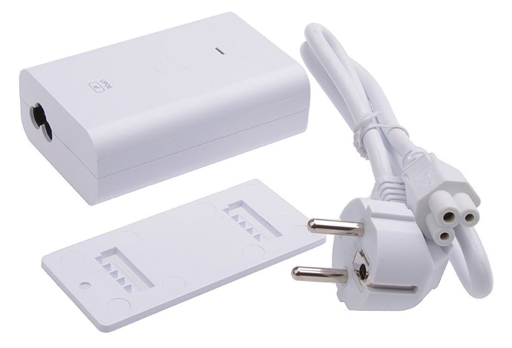 PoE adaptér mádva 1Gbit ethernetové porty. Díky držáku, který je součástí balení, jednoduše připevníte PoE injektor na zeď.