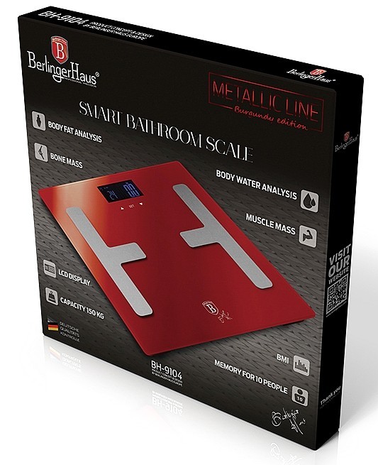 Digitální osobní váha značky Berlingerhaus vás nejen zváží, ale i zhodnotí vaši formu. Díky funkci tělesné analýzy vám změří tělesnou hmotnost, tělesný tuk, obsah vody v těle a podíl svalové hmoty a kostí a rovnou vám i spočítá BMI – to napoví, zda se pohybujete v pásmu podvýživy, normální váhy, nadváhy či obezity. Navíc vám také zobrazí příbytek nebo úbytek váhy oproti poslednímu měření. Vstupní data pro analýzu může do paměti váhy zadat až 10 osob.