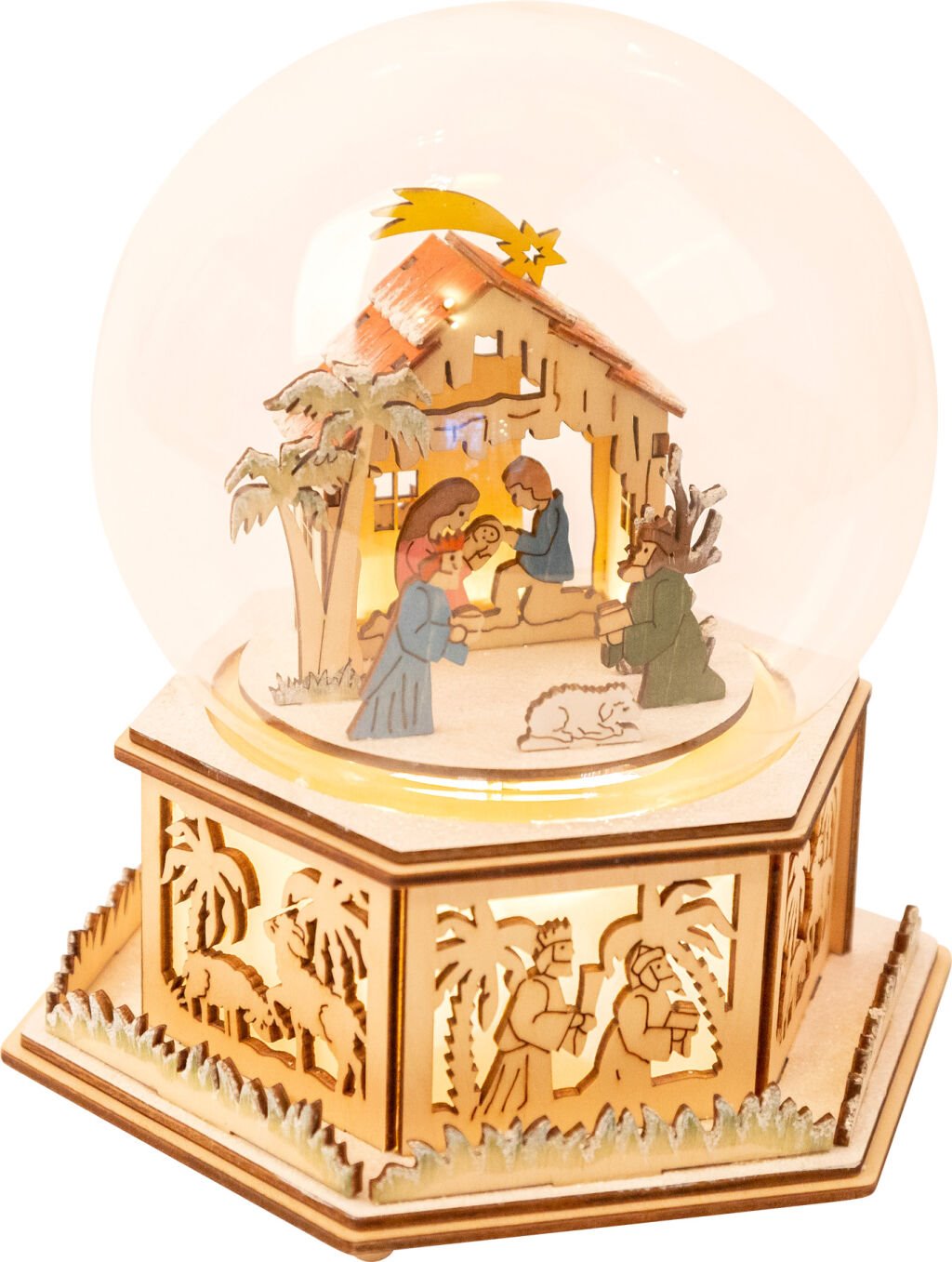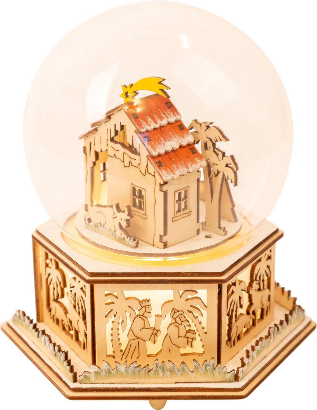 Zpříjemněte si vánoční atmosféru krásnou dekorací v podobě sněhové koule s Betlémem. Je vyrobená z kvalitního dřeva a funguje zároveň jako hrací skříňka. Zaposlouchejte se do melodie známé koledy „Tichá noc”. Zatímco skříňka hraje, koule vdává příjemně tlumené světlo. Jemné vyřezávané detaily zaujmou na první pohled. Napájíte ji pomocí baterií (nejsou součástí balení).