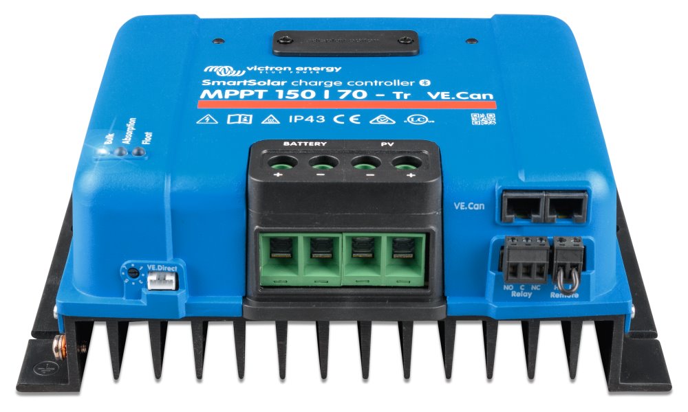 Robustní a rychlý MPPT regulátor s VE.Can pro náročné podmínky s napětím panelů až 150 V, nabíjecí proud 70 A. Baterie 12/24/48 V, FV max. 1000/2000/4000 Wp. Vestavěné Bluetooth a konektor pro zásuvný displej.